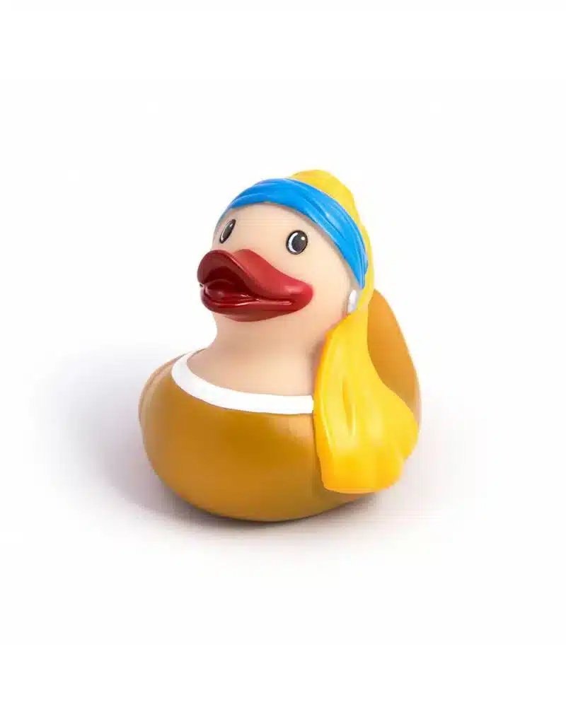 Rubber badeendje geïnspireerd op het Meisje met de parel van Vermeer.