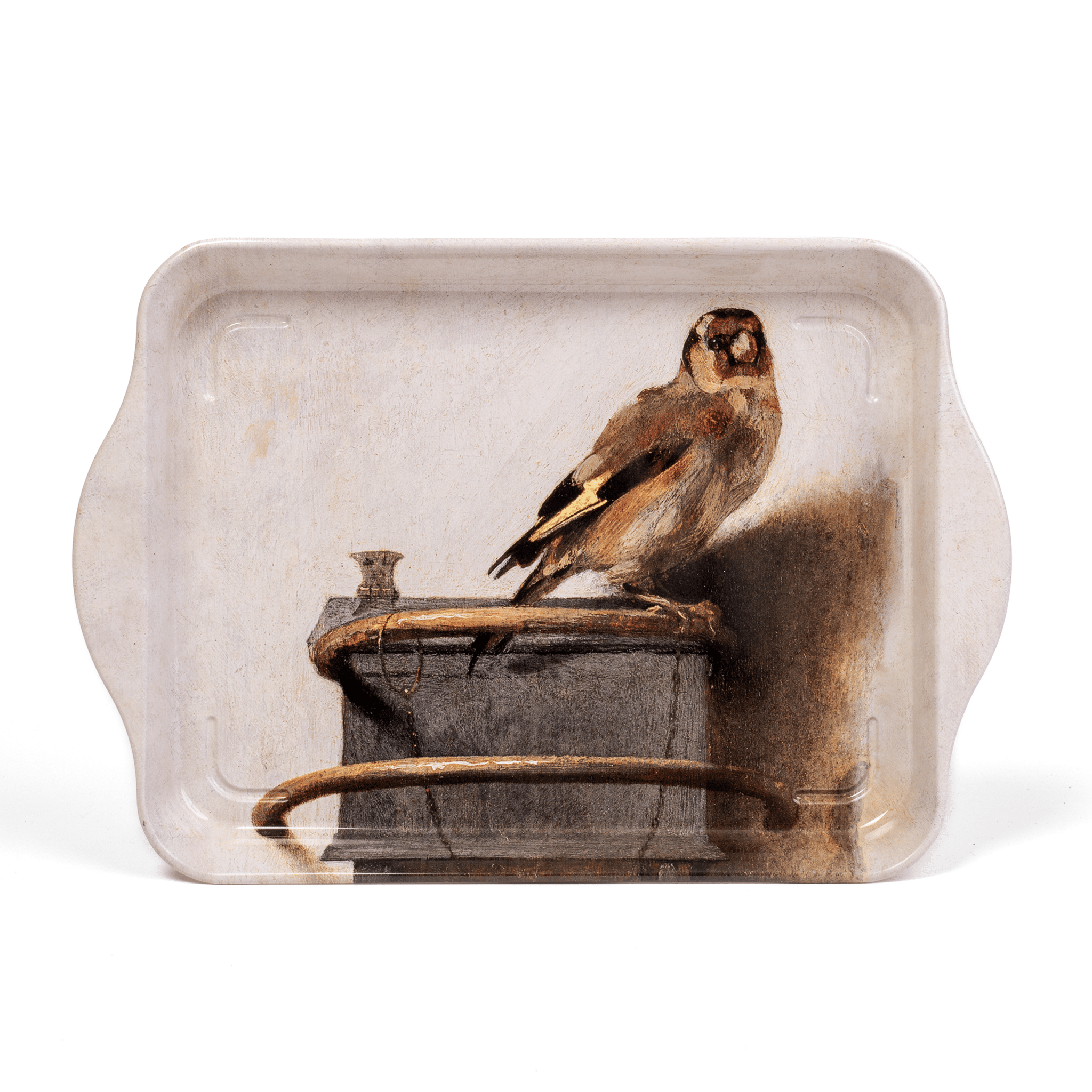 Klein formaat dienblad van metaal met een detail van Fabritius, Het Puttertje. Geschikt voor twee glazen of bekers, koekjes of hapjes.