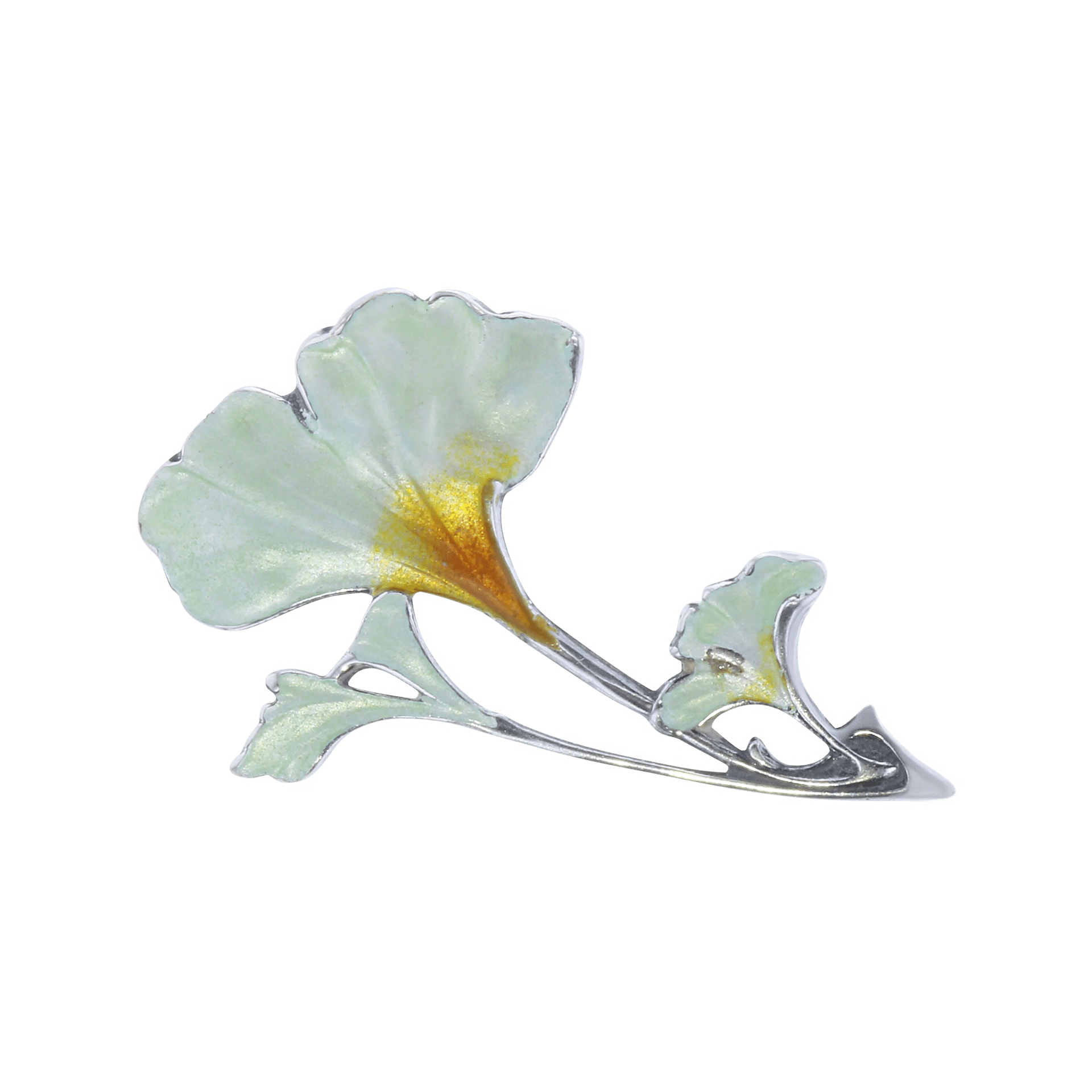 Deze verfijnde broche toont het iconische ginkgoblad, elegant vormgegeven in sterling zilver en met de hand geëmailleerd in zachte groentinten met een warme gouden gloed aan de basis.