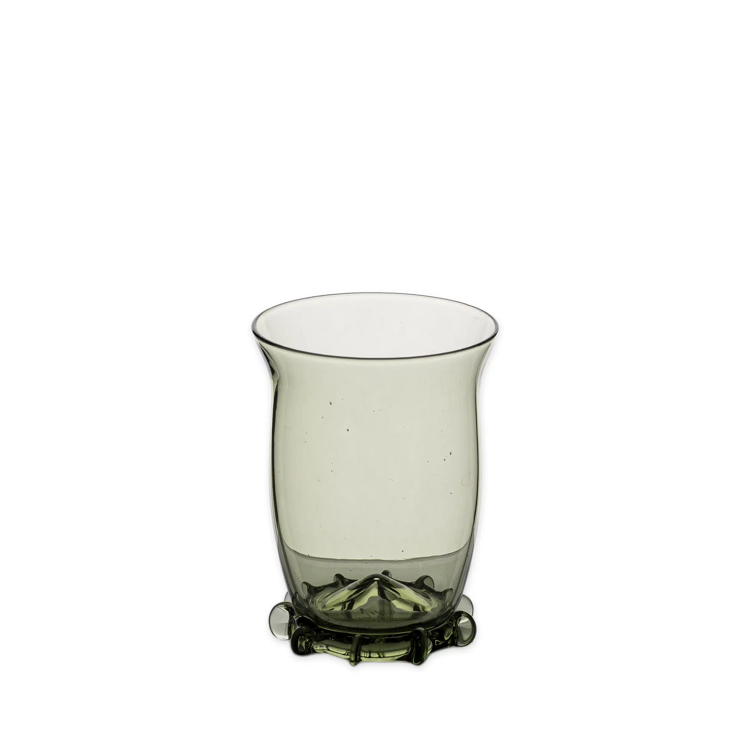 Bosglas ( Waldglas) kwam uit het bosgebied van Midden – Europa waar de benodigde grondstoffen onder handbereik waren.Potas uit asresten van beukenhout, adelaarsvarens en wat ijzeroxide gaven het bosglas de kenmerkende groene of bruine kleur.De noppen en bramen aan de buitenkant van het glas zorgde voor een goede grip.De mondgeblazen glazen kunnen qua vorm en kleur verschillen en hebben soms luchtbellen.Onze glazen replica’s uit de 17e eeuw komen uit Tsjechië.