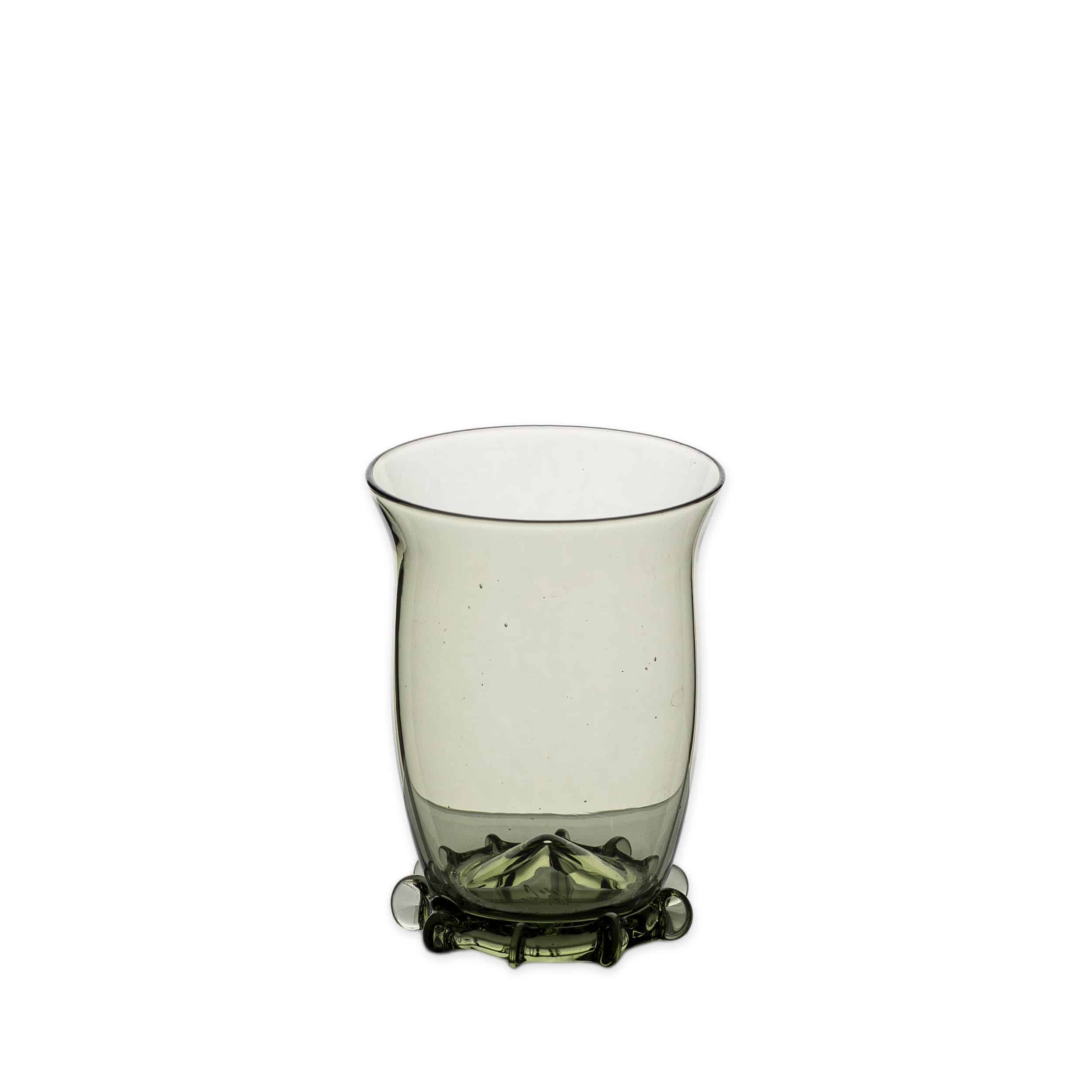 Bosglas ( Waldglas) kwam uit het bosgebied van Midden – Europa waar de benodigde grondstoffen onder handbereik waren.Potas uit asresten van beukenhout, adelaarsvarens en wat ijzeroxide gaven het bosglas de kenmerkende groene of bruine kleur.De noppen en bramen aan de buitenkant van het glas zorgde voor een goede grip.De mondgeblazen glazen kunnen qua vorm en kleur verschillen en hebben soms luchtbellen.Onze glazen replica’s uit de 17e eeuw komen uit Tsjechië.