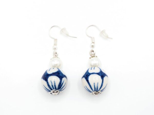 Oorbellen met delft blauwe porseleinen kraal en wit pareltje, nikkelvrij. Lengte: 4 cm