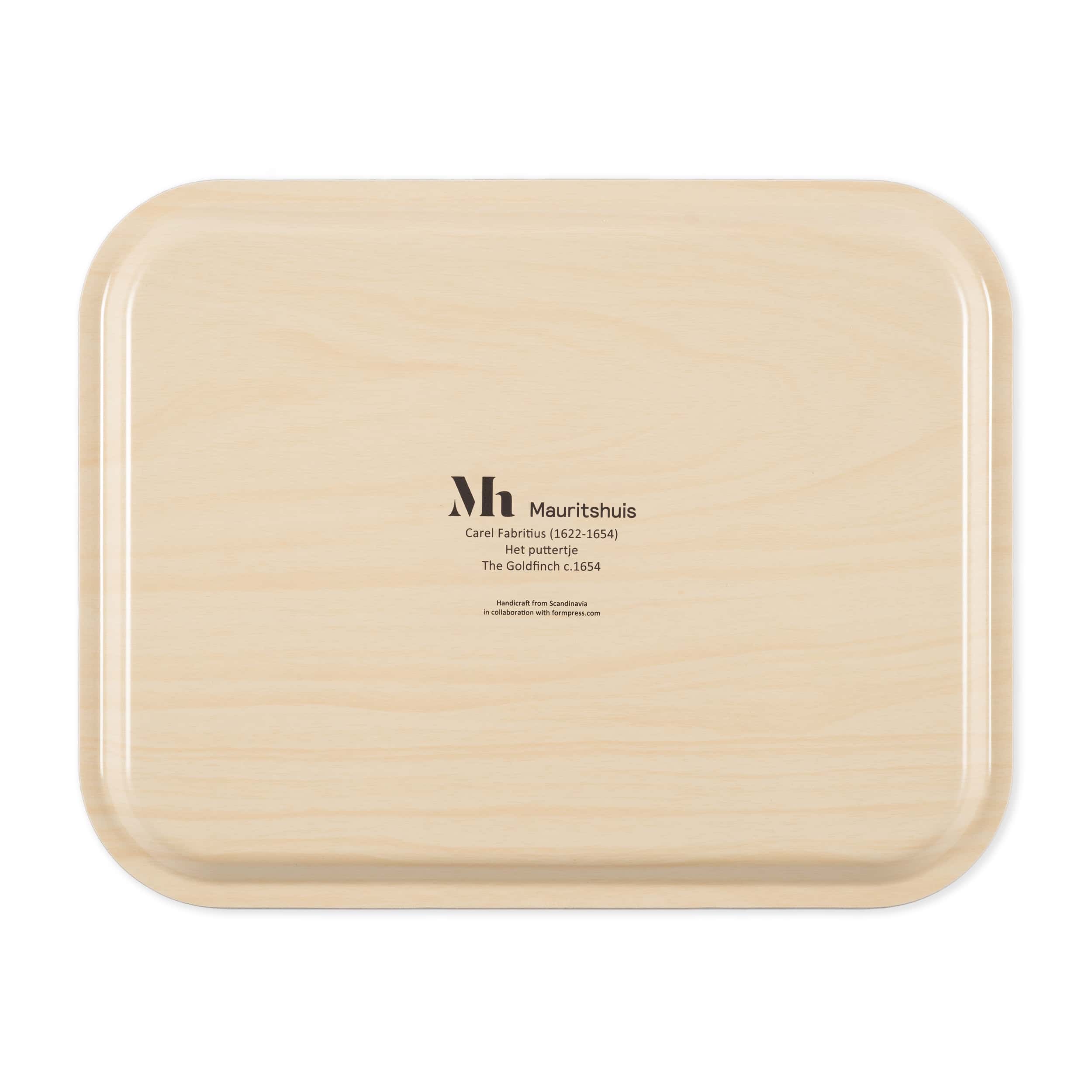 Stevig dienblad met een detail van Carel Fabritius, Het puttertje. Het blad heeft een licht opstaande rand.