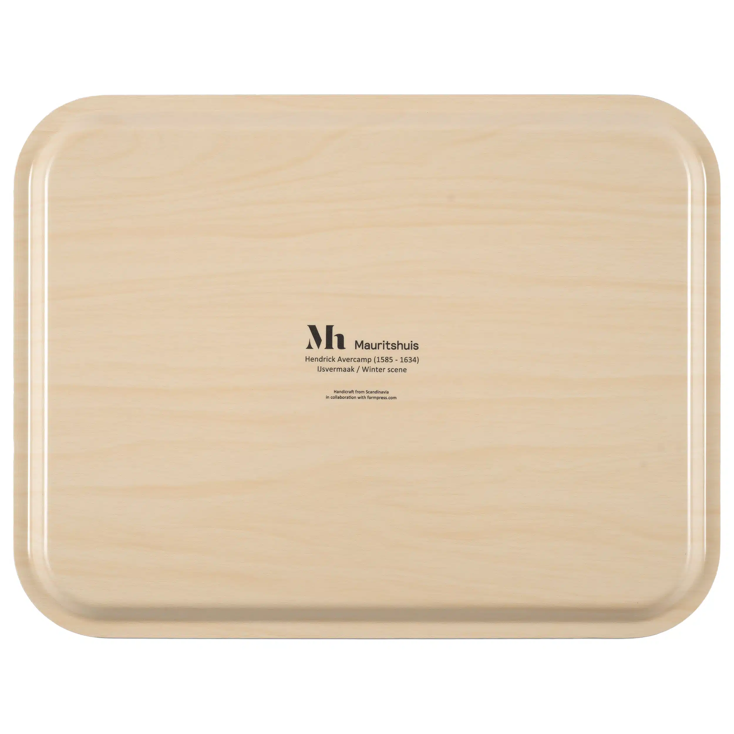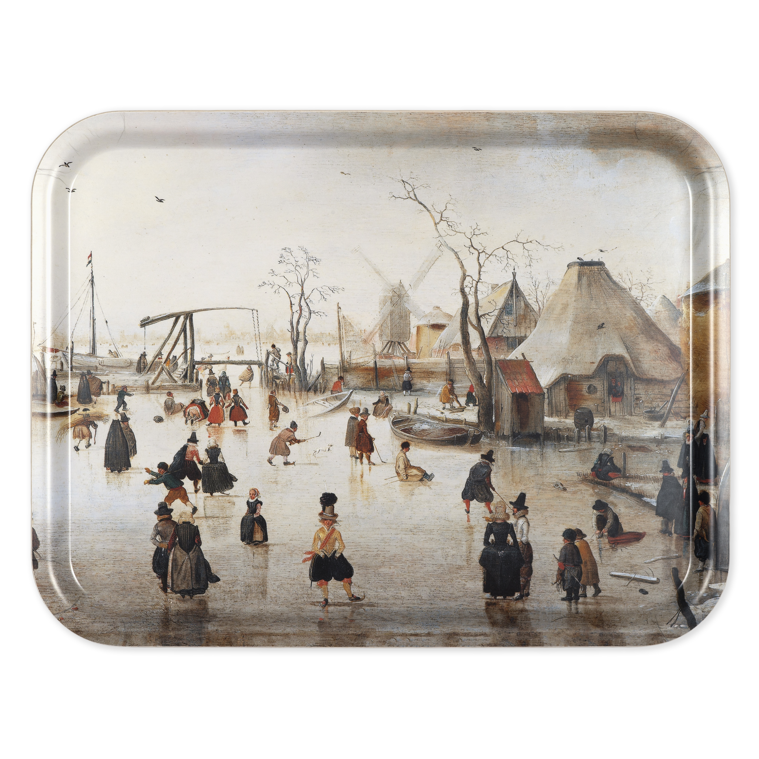 Stevig dienblad met een detail van Hendrick Avercamp, IJsvermaak. Het blad heeft een licht opstaande rand. Afmetingen: 36 x 28 centimeter Materiaal: geperst berkenhout