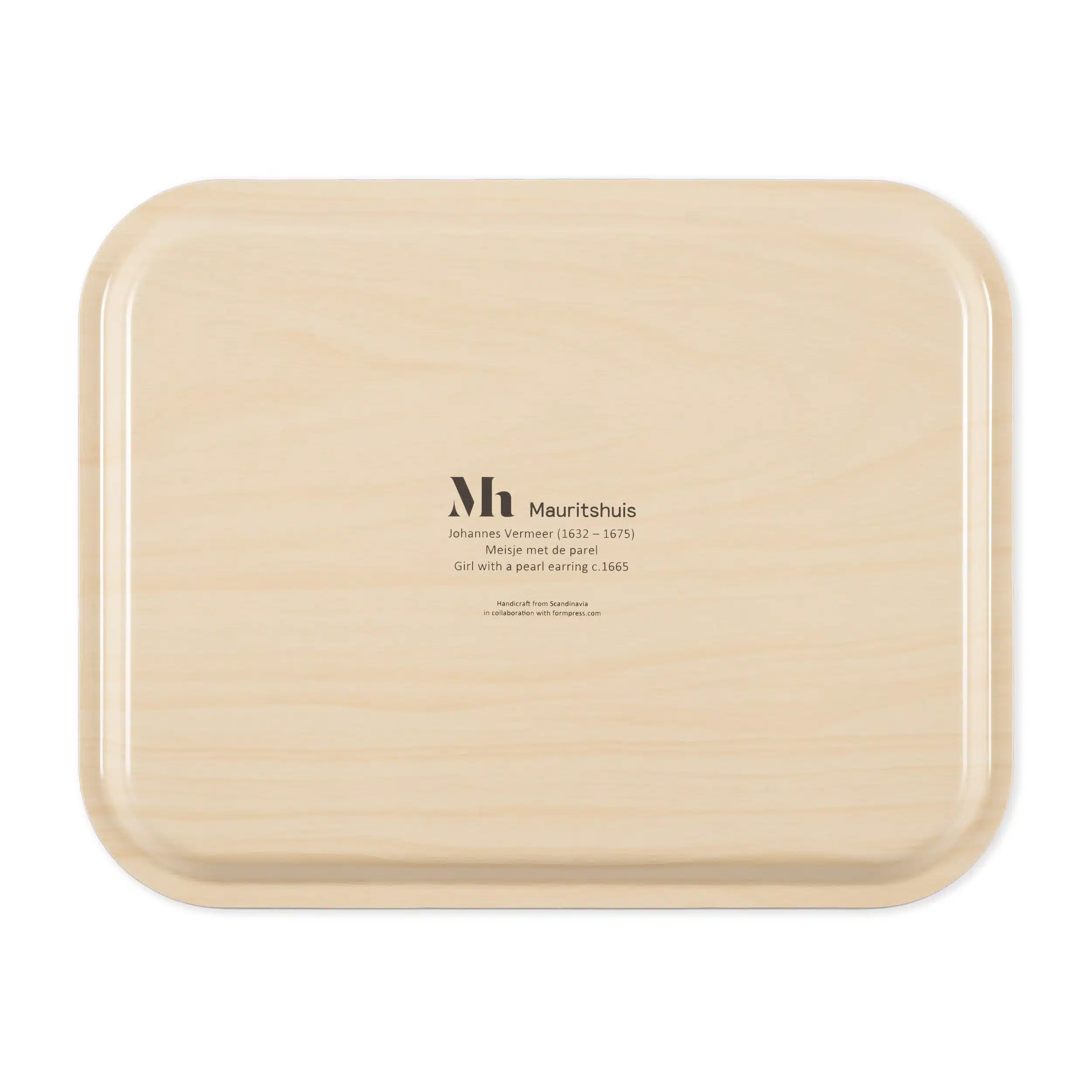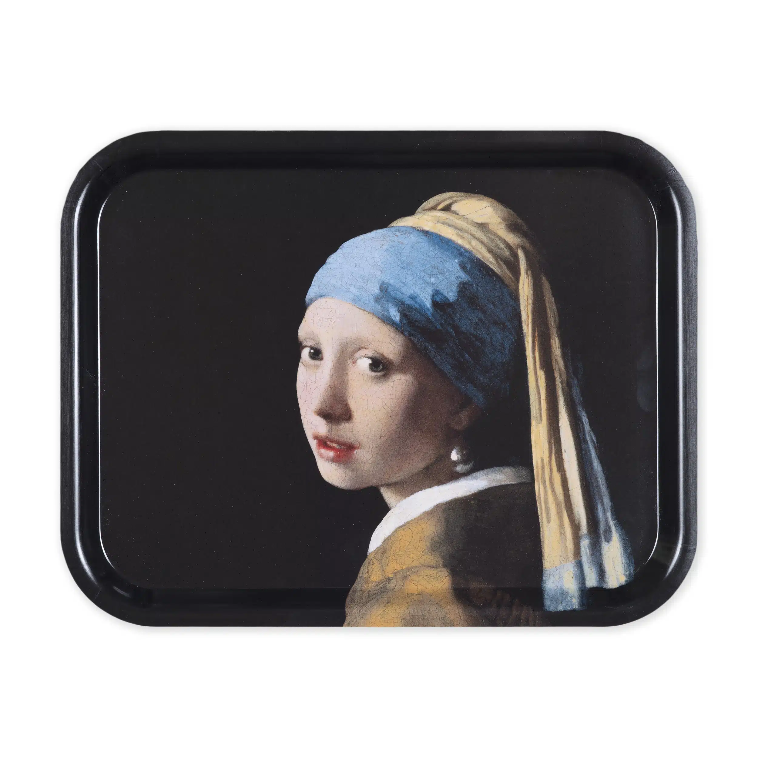 Stevig dienblad met een detail van Johannes Vermeer, Het meisje met de parel. Het blad heeft een licht opstaande rand. Afmetingen: 36 x 28 centimeter Materiaal: geperst berkenhout