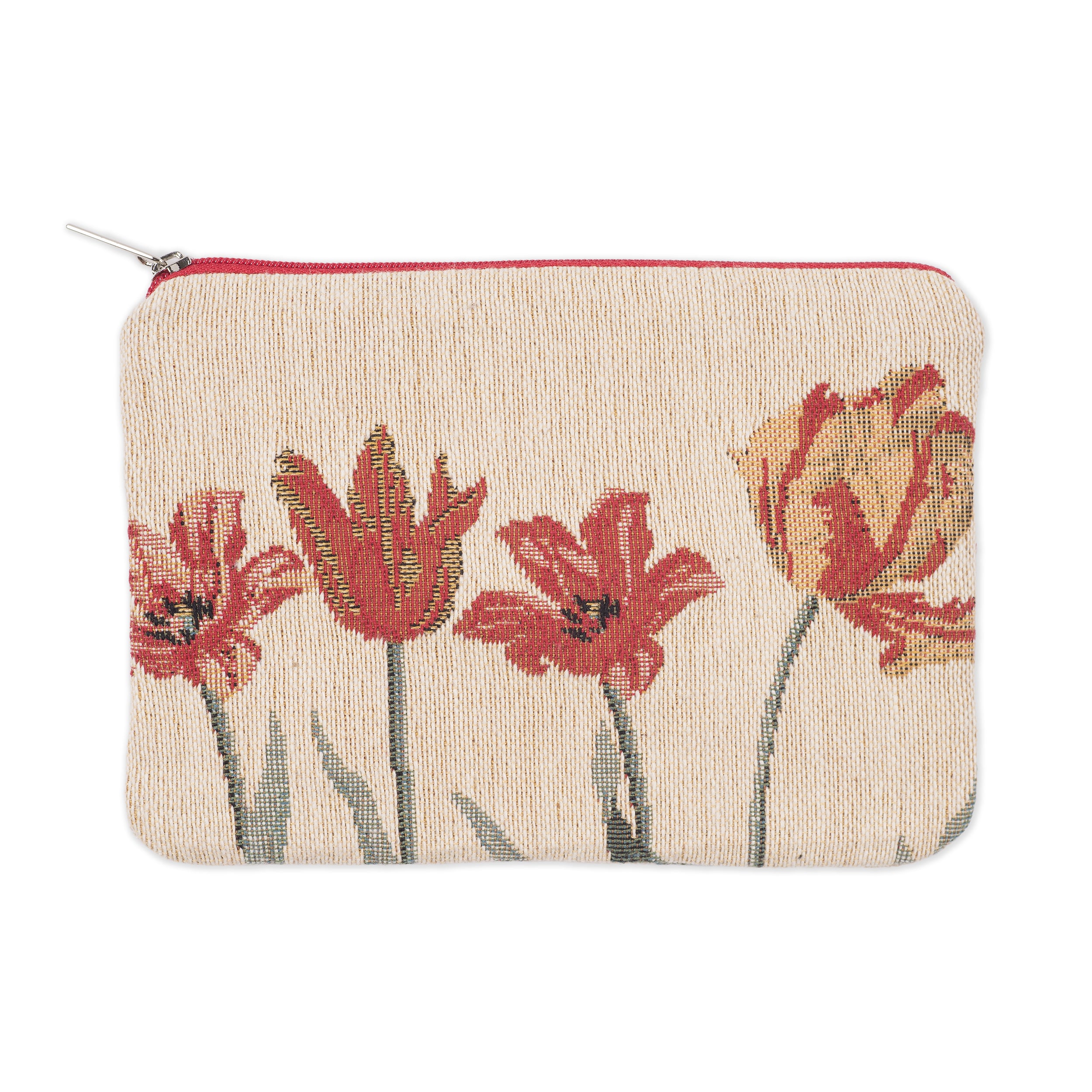 Geweven etui met ritssluiting en met tulpendecoratie op een crèmekleurige achtergrond.