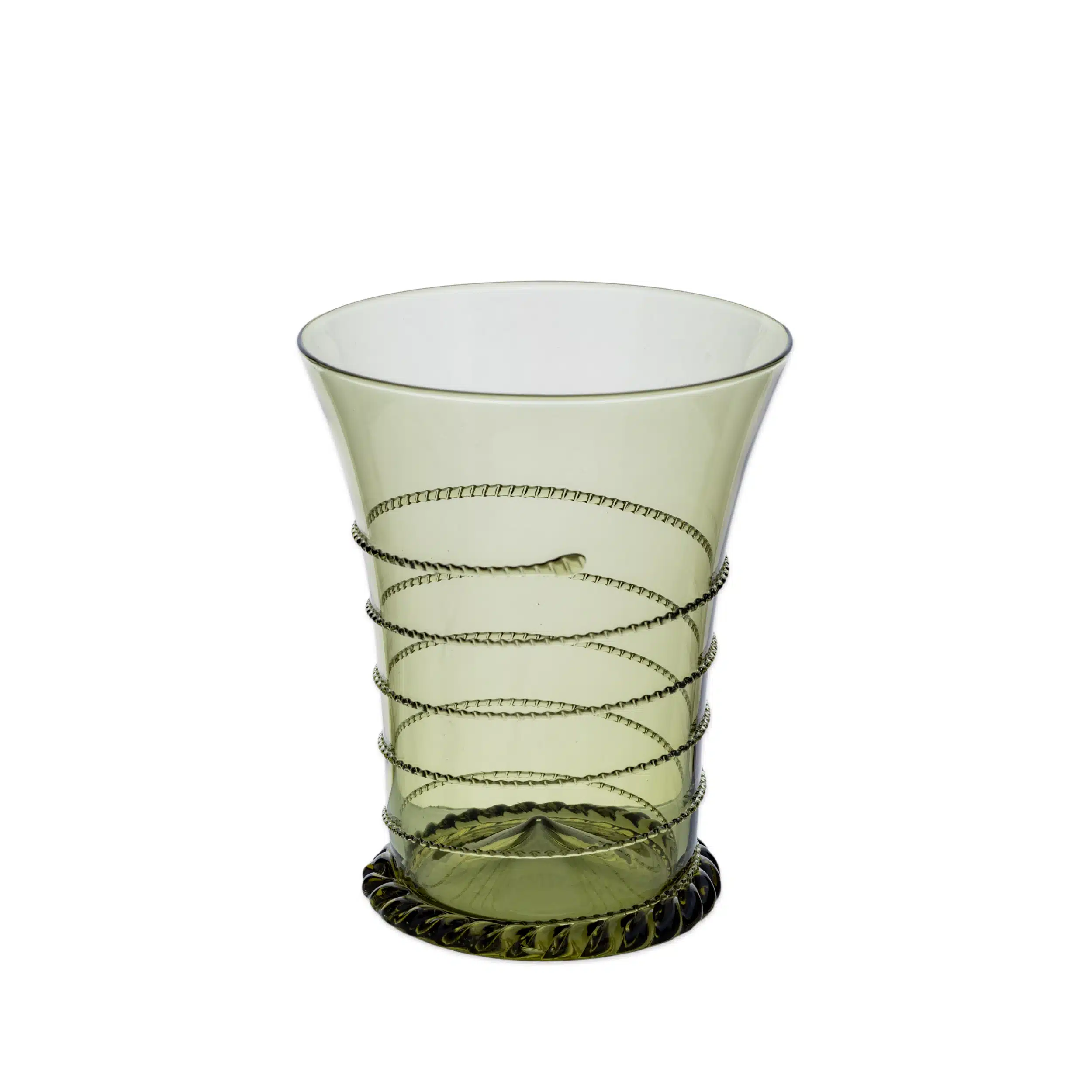 Elegant glaasje gedecoreerd met spiralen lijnen. Het glas is mondgeblazen.