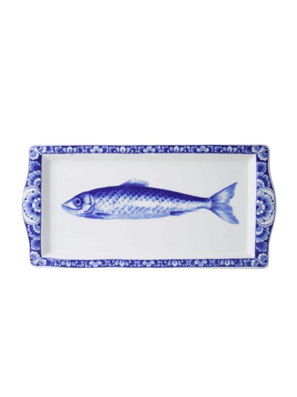 Delfts blauwe schaal gedecoreerd met een haring, voor het serveren van bijvoorbeeld vis. Afmeting: ca. L 30 cm, B 15 cm, H 2,5 cm Werkwijze: Transfer Gewicht: 540 gr.