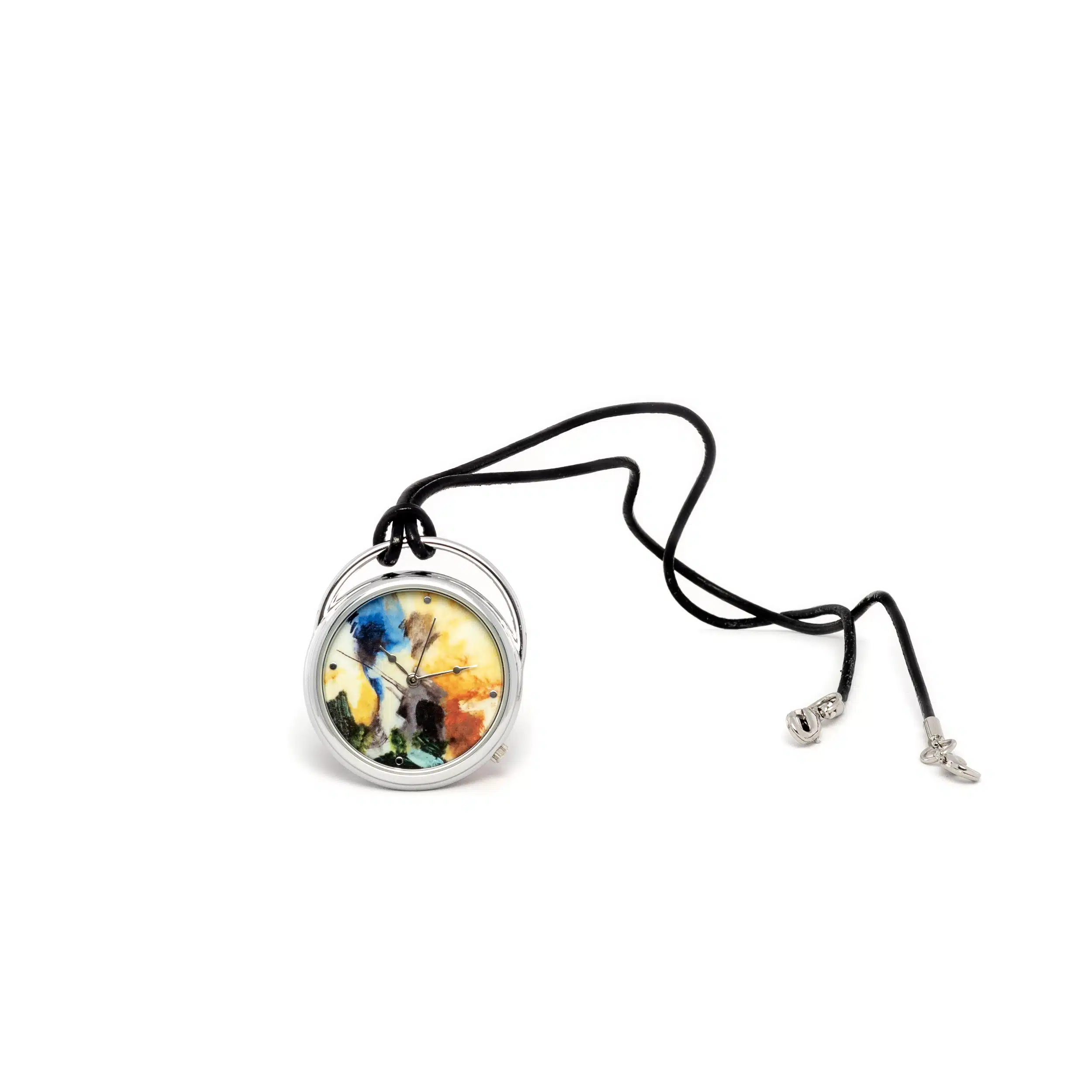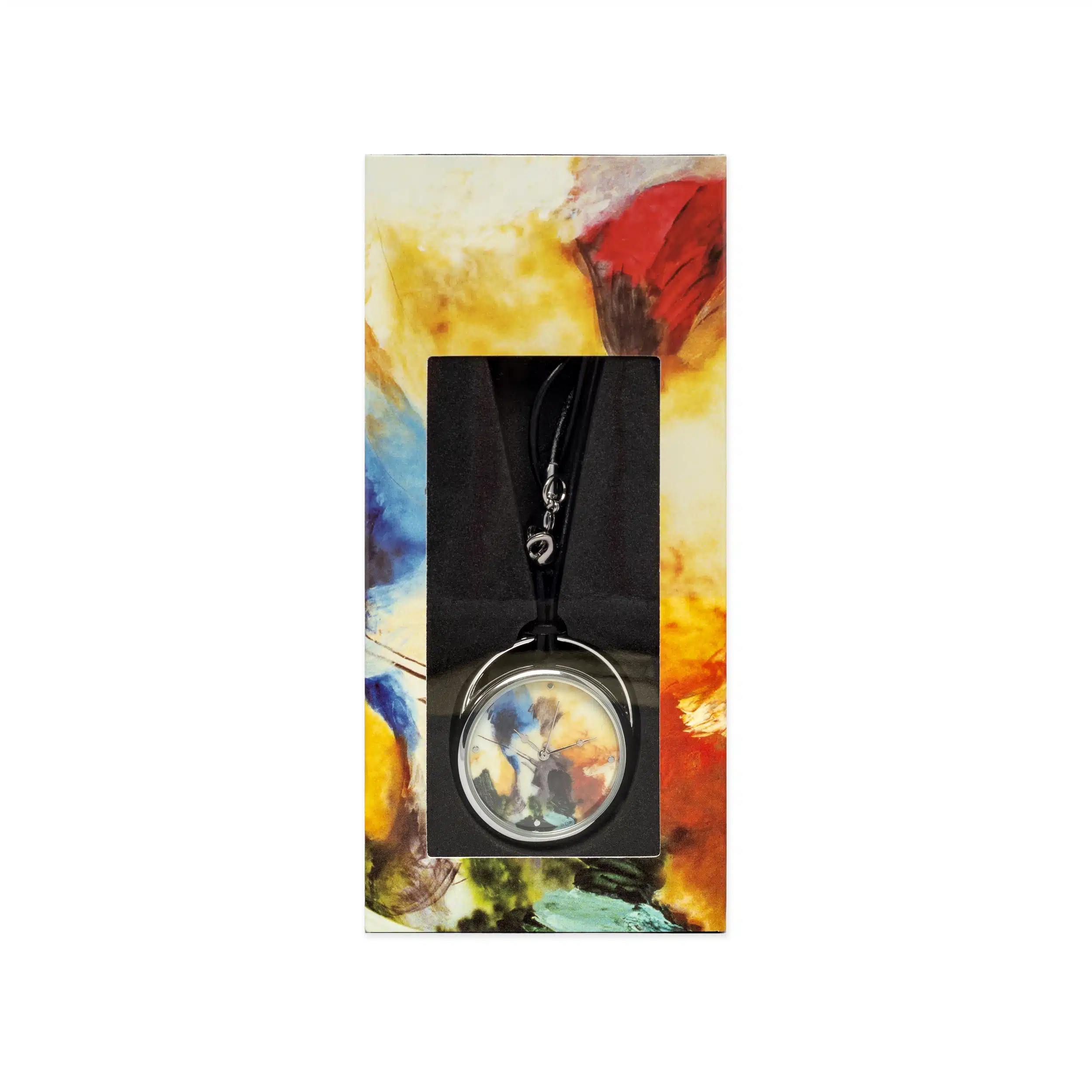 De kleuren in de afbeelding, een levendige mix van blauw, geel en oranje, symboliseren zowel de lucht als het vuur – elementen die het lot van Icarus bezegelden. De abstracte penseelstreken voegen een extra laag aan betekenis toe, die de vluchtigheid van de menselijke ervaring benadrukt. Dit horloge, met zijn gedetailleerde reproductie van het kunstwerk, vangt de essentie van deze diepzinnige boodschap.