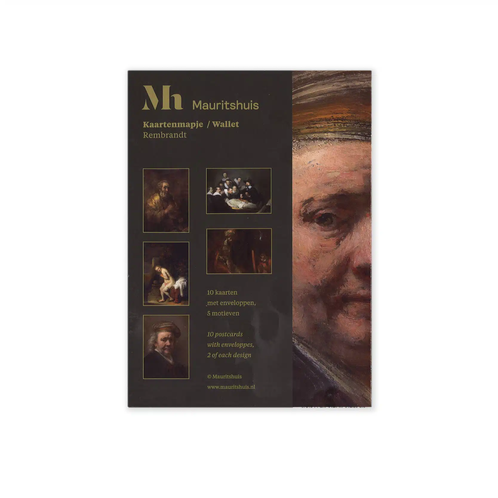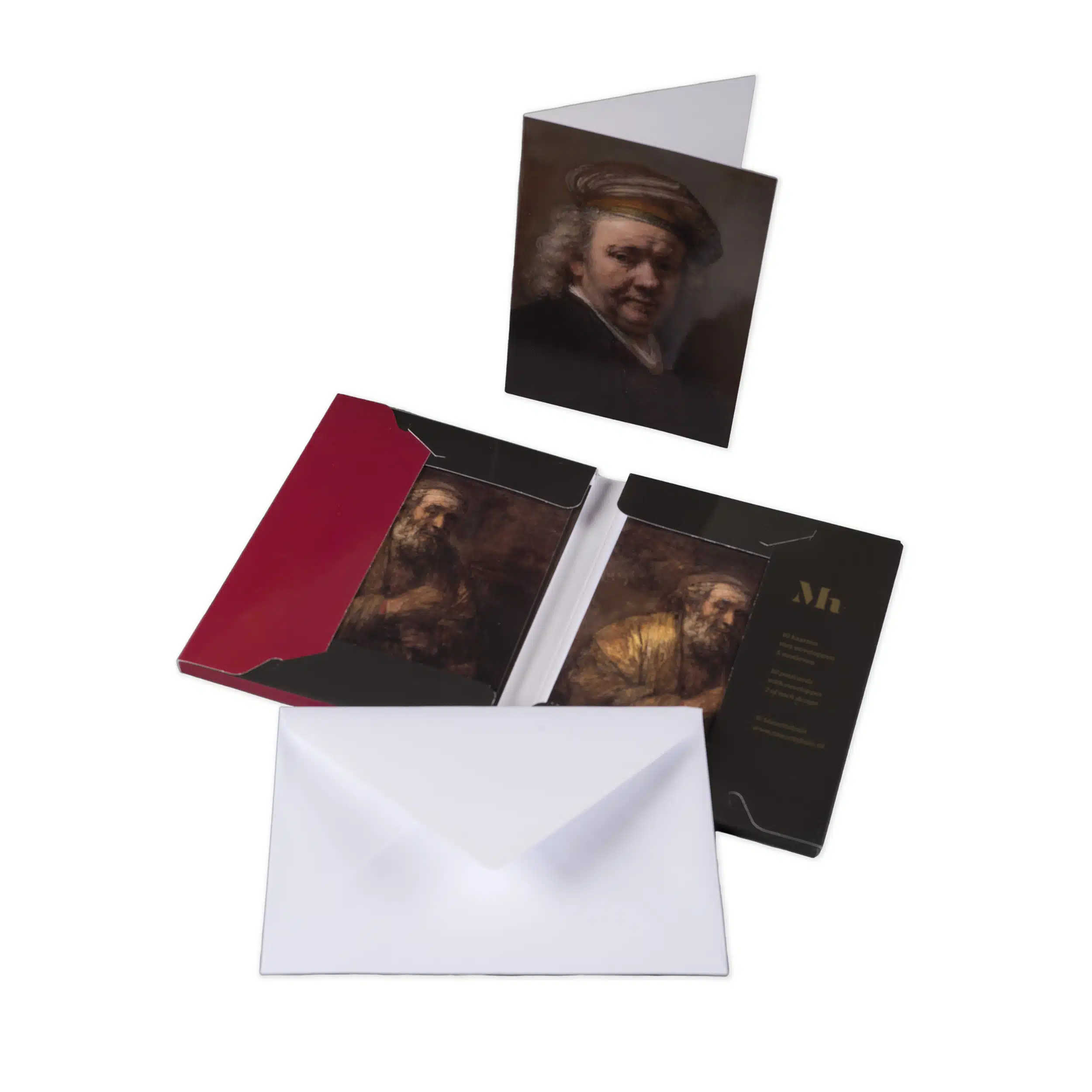 Kaartenmap met 10 dubbele kaarten met enveloppen. Vijf verschillende afbeeldingen van Rembrandt. Blanco binnenzijde.