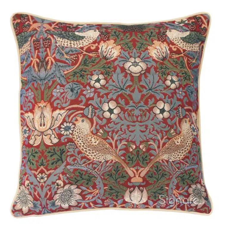 Een weelderig ontwerp dat direct herkenbaar is als het werk van William Morris designs; het reproduceert een origineel wandtapijt van hem gemaakt in de 19e eeuw genaamd Strawberry Thief, ook bekend als William Morris-vogels. Het verbeeldt een verhaal waarom de sappige, rijpe aardbeien altijd in de tuin verdwijnen. De geestige ogen van de vogels vertellen alles.