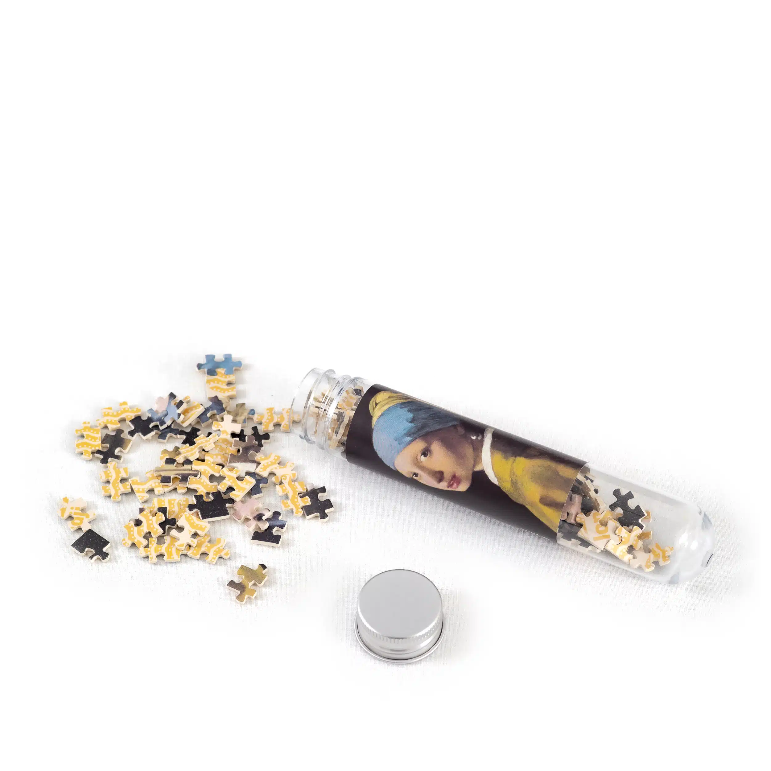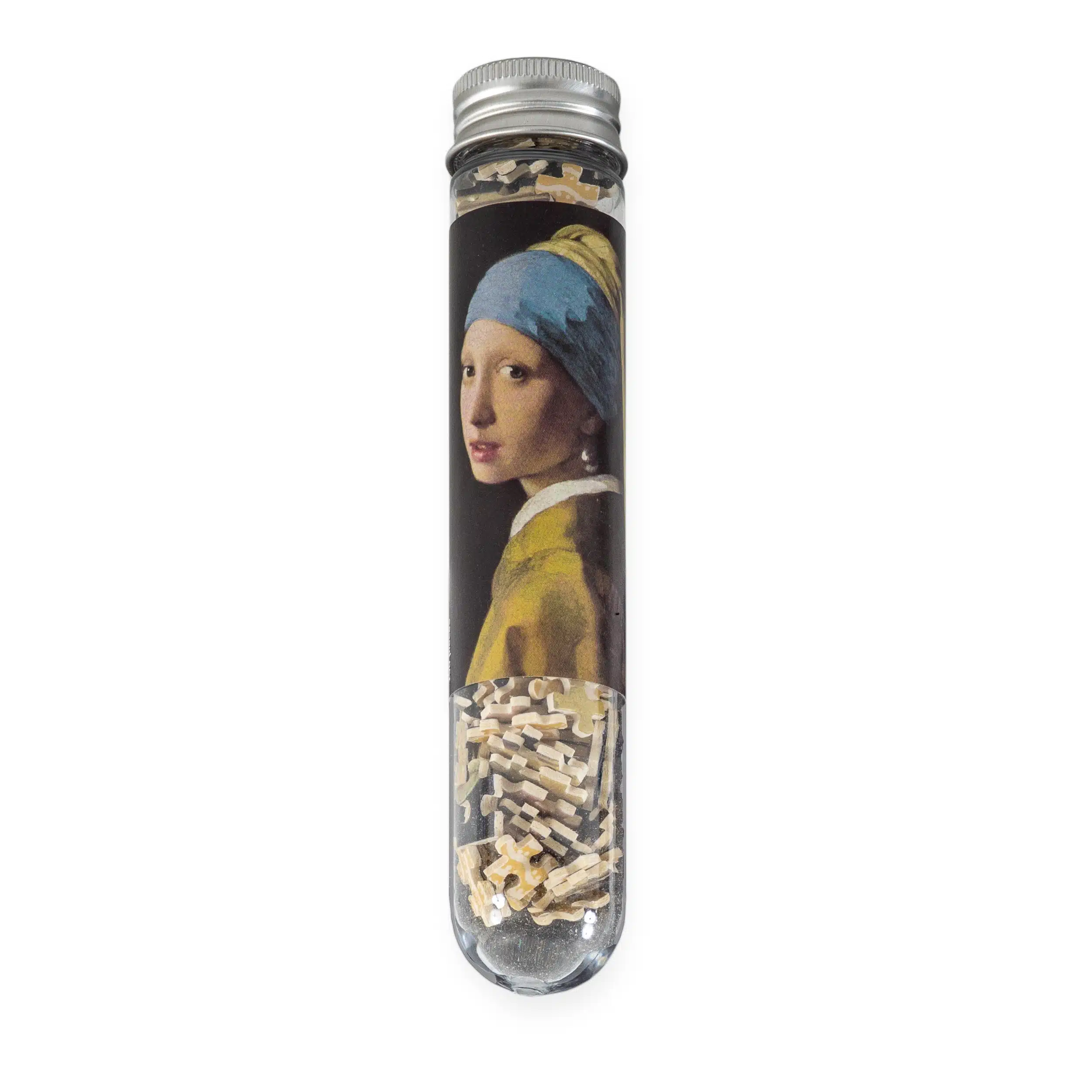Mini puzzel van het Meisje met de parel van Vermeer.De puzzel van 150 stukjes wordt geleverd in een tube met draaidop. Maat 10 x 15 cm