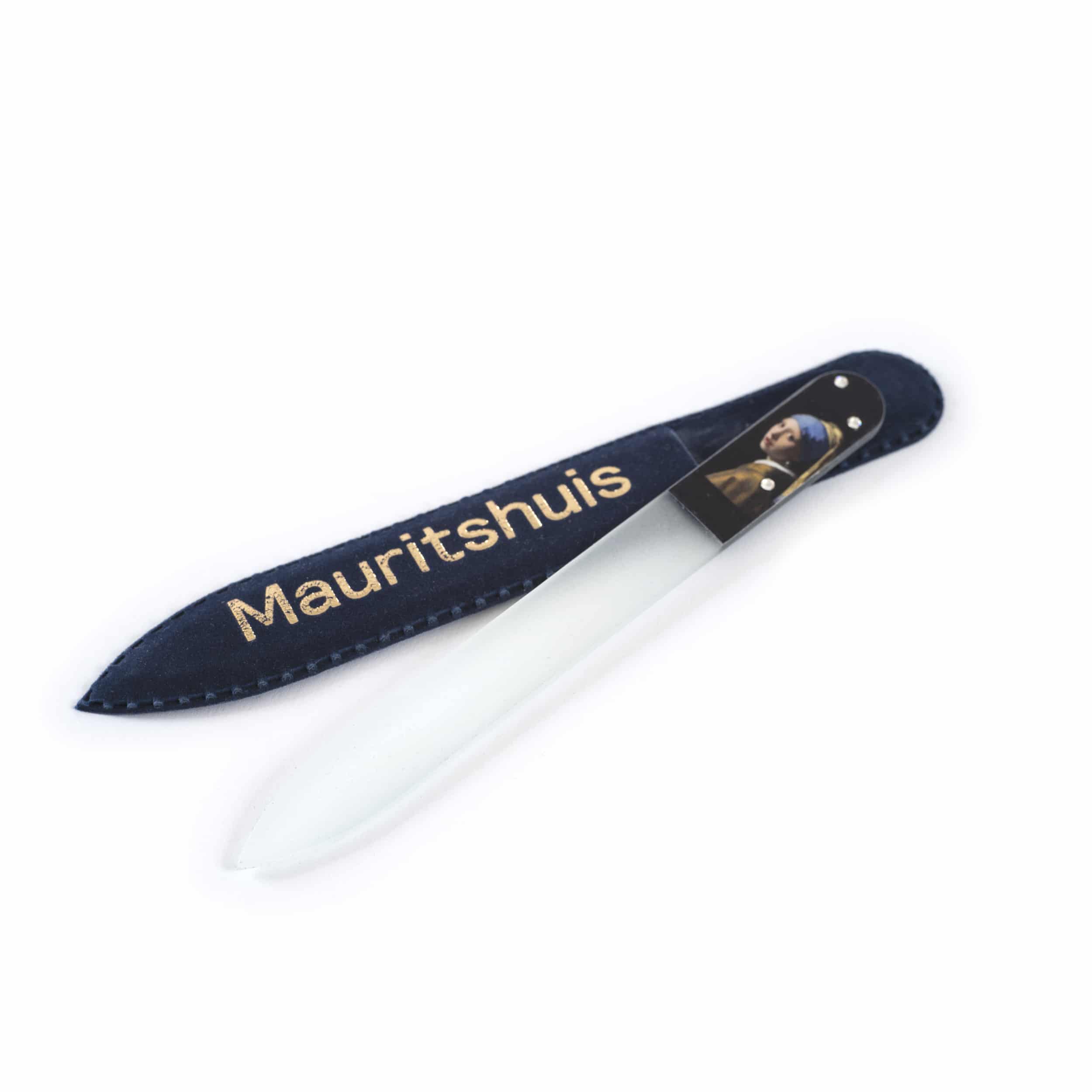 Glasvijl met een afbeelding van het Meisje met de parel en glitter steentjes.De glasvijl heeft een fijne structuur waardoor het beter je nagels beschermt.Slijt niet en makkelijk schoon te houden.Deze vijl wordt geleverd in een mooi donkerblauw hoesje. Afmeting: ca. 12 x 0,8 cm