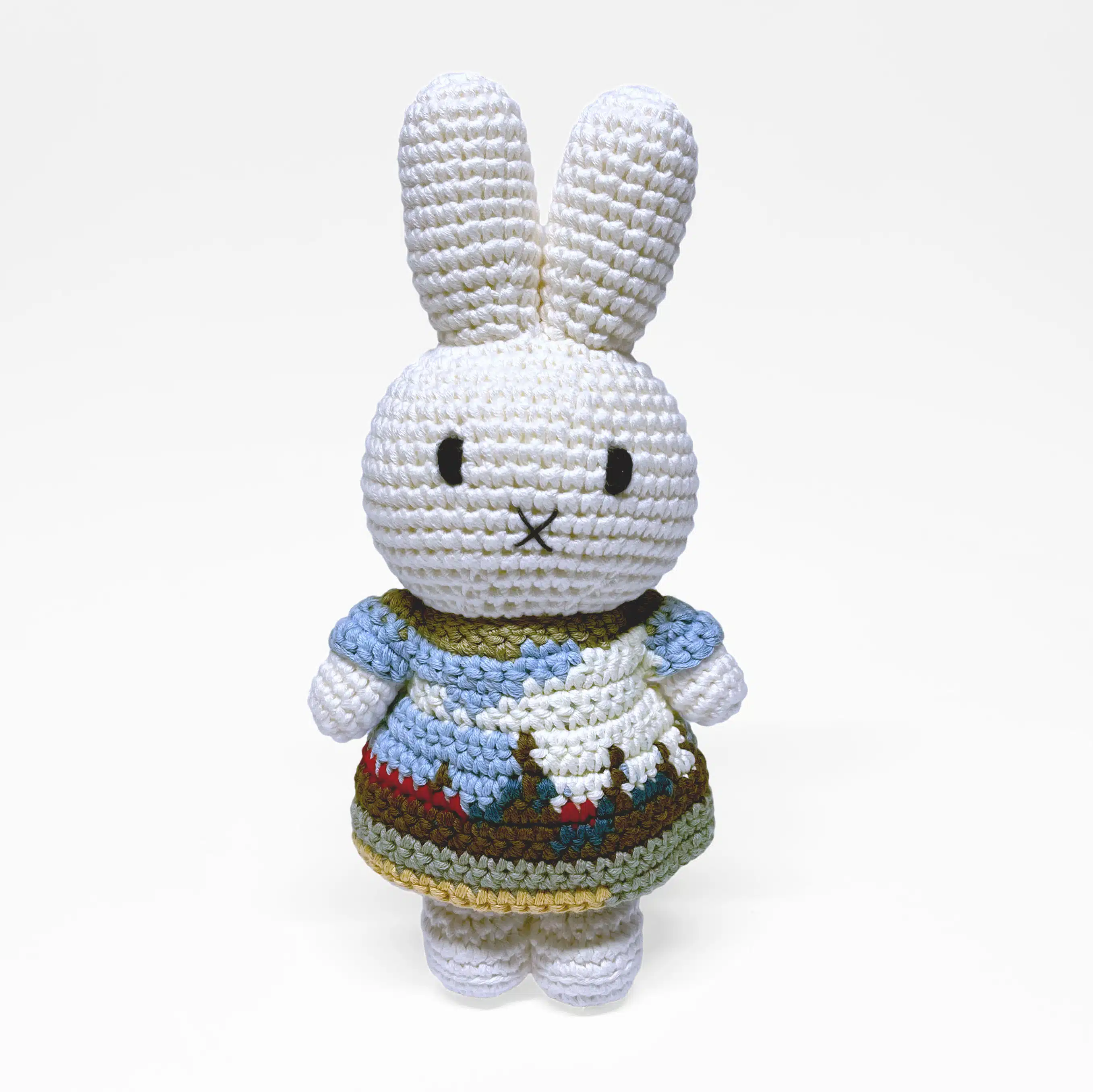 Deze handgehaakte Nijntje dragt een outfit met details uit het meesterwerk Gezicht op Delft van Johannes Vermeer. Een unieke combinatie van kunst en karakter, die zorgt voor een bijzonder en origineel verzamelstuk of cadeau. Kunst om te knuffelen