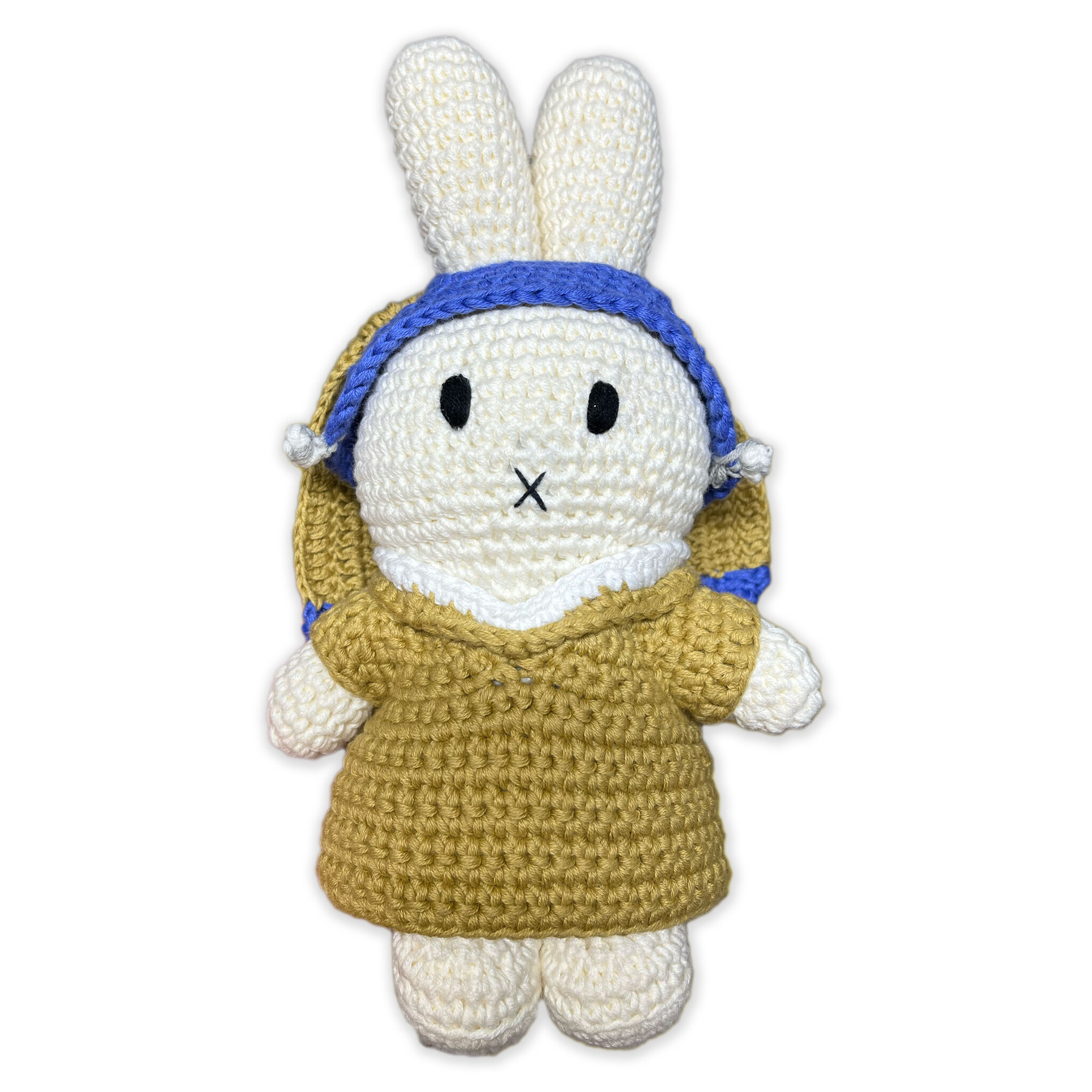 Nijntje pop met Vermeer’s Meisje met Parel outfit, handgemaakt. Geïnspireerd op Vermeers beroemde schilderij ‘Meisje met de parel’. 100% biologisch katoen, gehaakt Hoogte: ca. 27cm