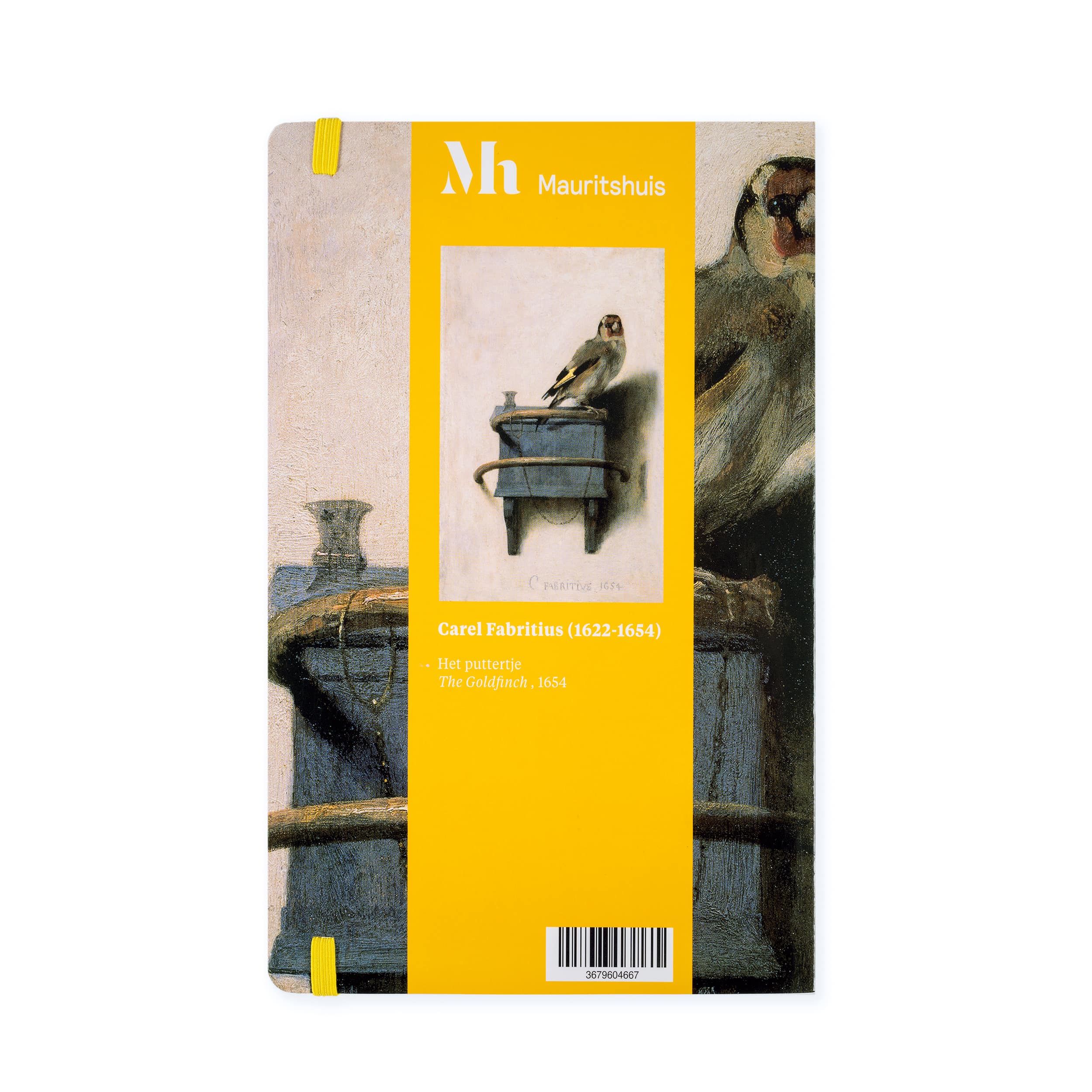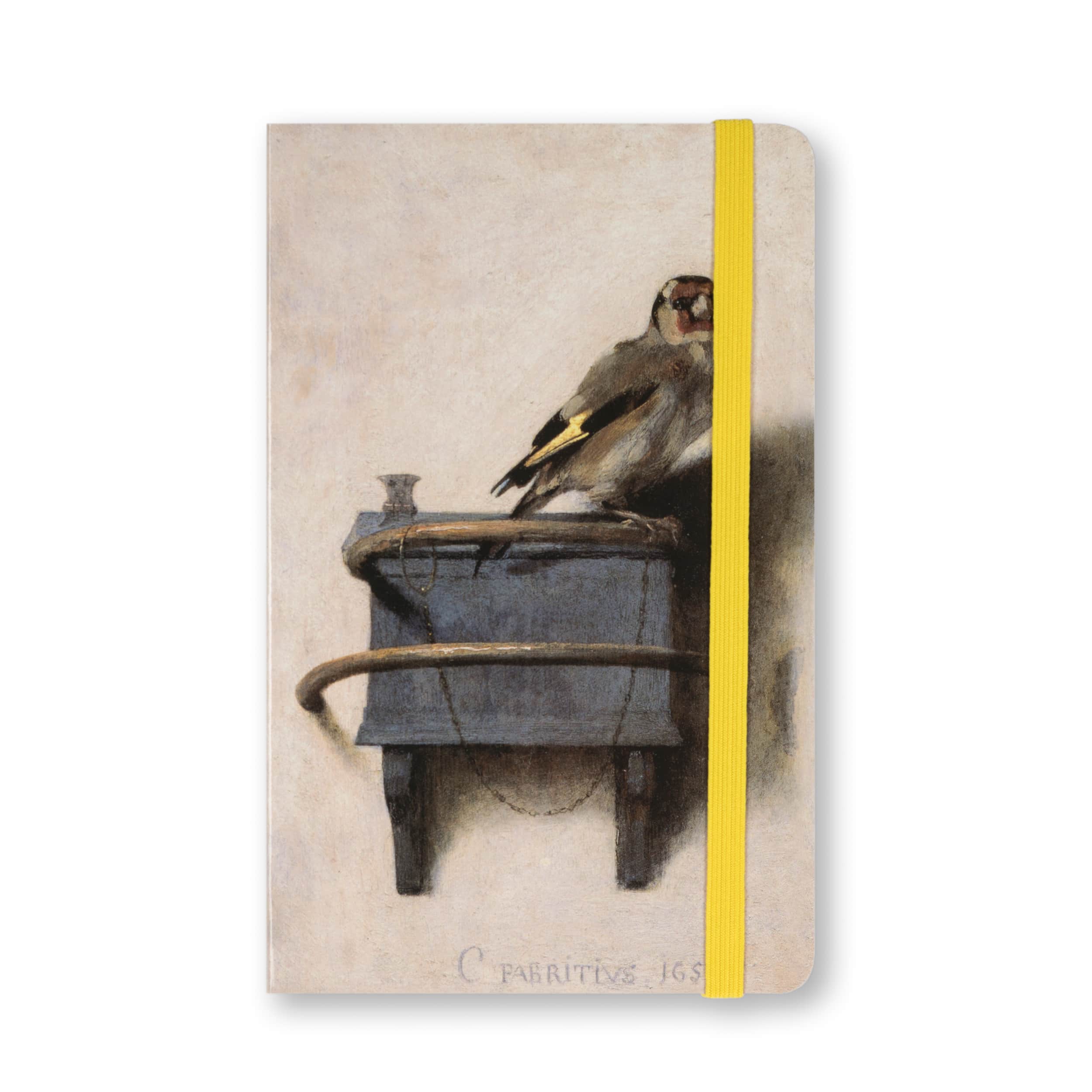 Dubbelzijdig ongelinieerd notitieboek met elastiek in bijpassende kleur op A6-formaat. Op de harde kaft een detail van het schilderij van Carel Fabritius, Het puttertje.