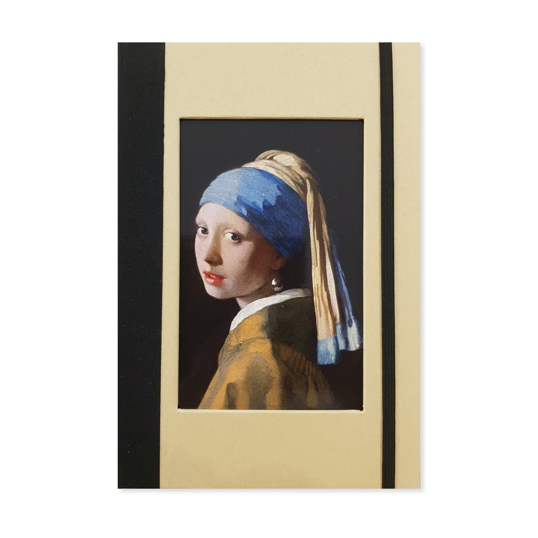 Blanco notitieboek met elastiek. Een harde passe-partout kaft met een afbeelding van het Meisje met de parel. Afbeelding uitwisselbaar.