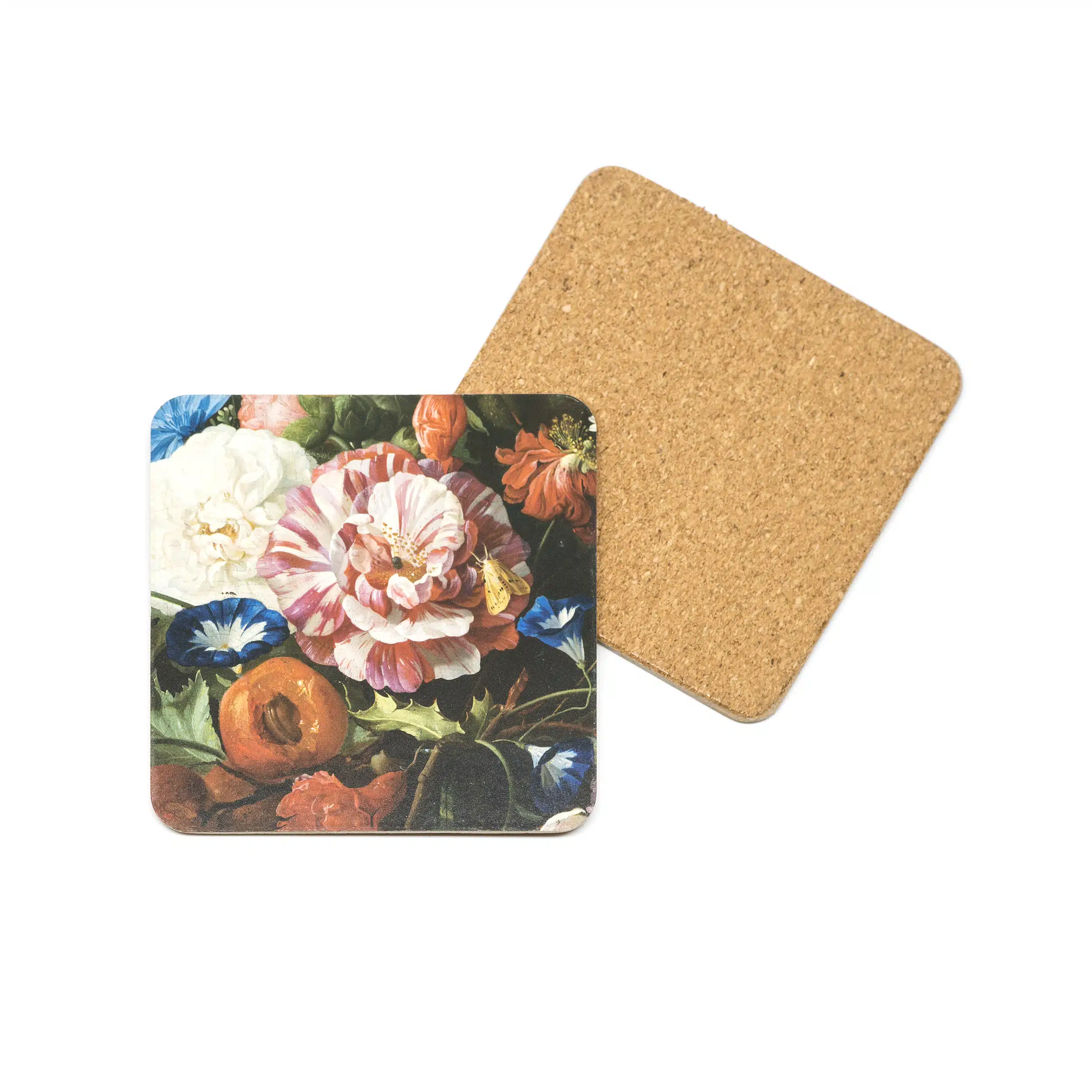 Onderzetter met een afbeelding van De Heem, Vaas met bloemen. Afmeting: ca. 9,5 x 9,5 cm Materiaal: Kurk/Papier
