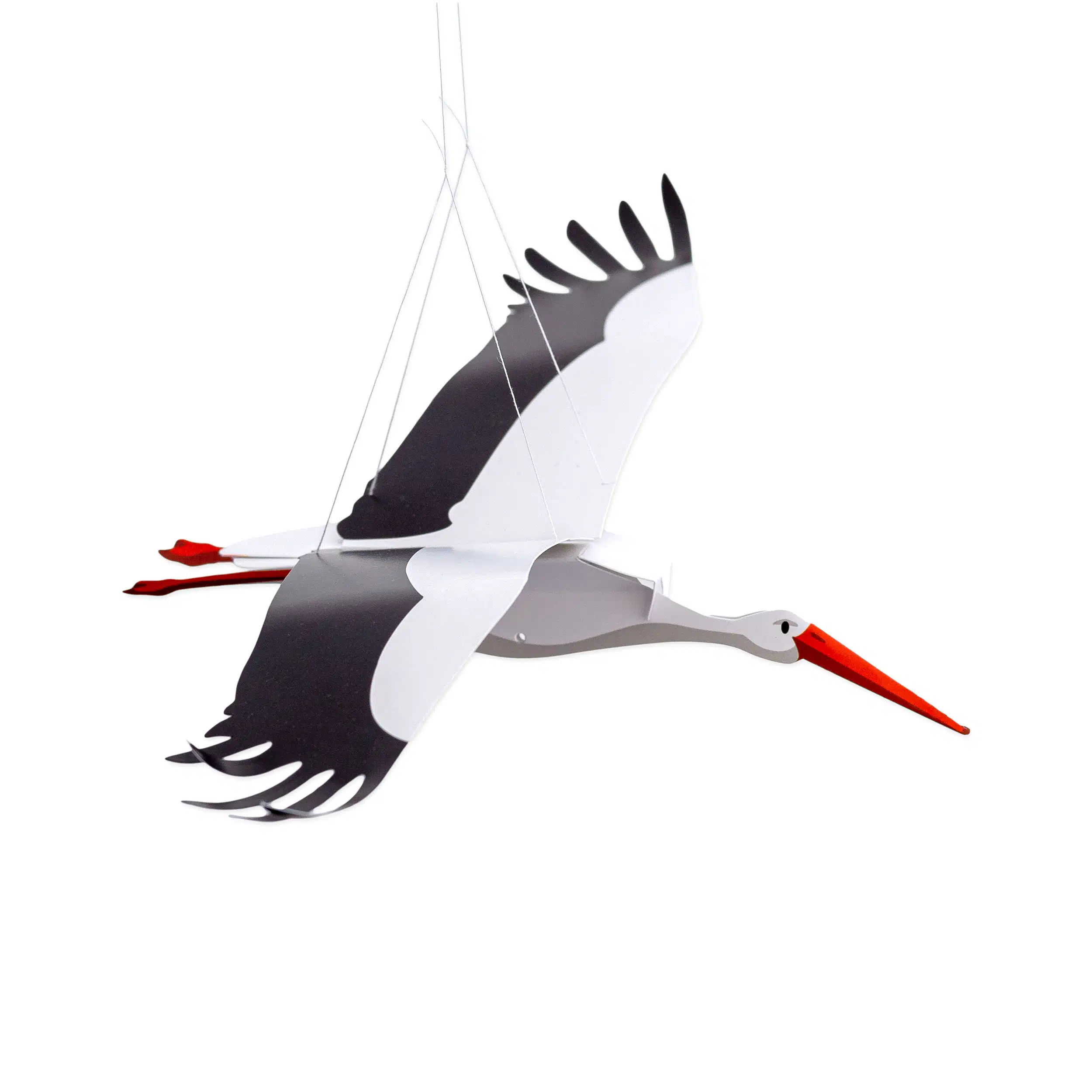 Deze ooievaar is eenvoudig in elkaar te zetten zonder schaar of lijm.Hang hem aan de vleugels en laat hem vliegen door te trekken aan een draadje aan zijn buik.