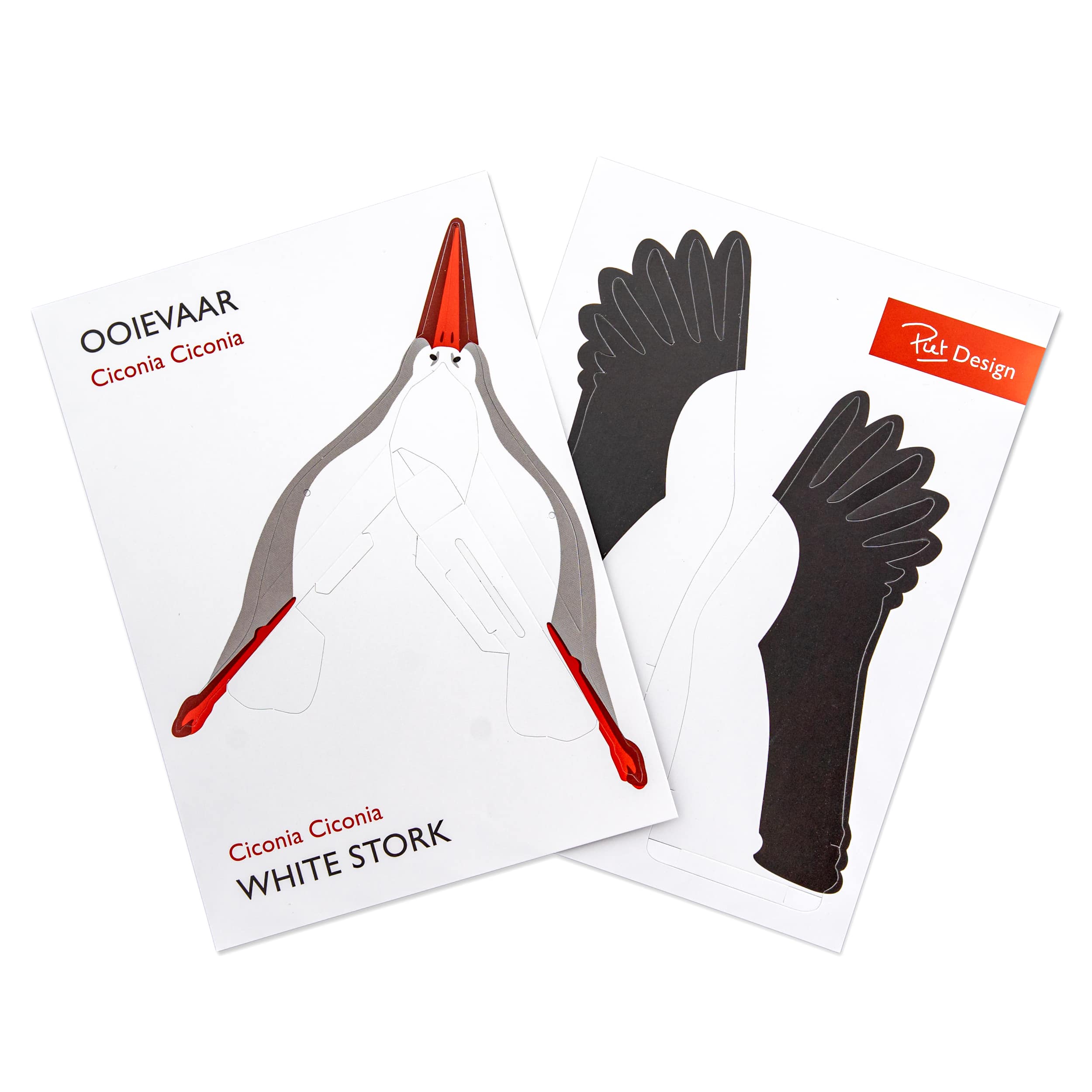 Deze ooievaar is eenvoudig in elkaar te zetten zonder schaar of lijm.Hang hem aan de vleugels en laat hem vliegen door te trekken aan een draadje aan zijn buik.