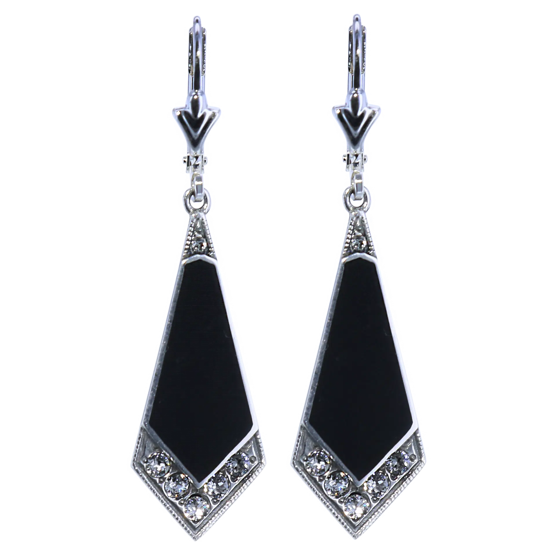 Oorbellen geinspireerd door Georges Fouquet, Frans beeldend kunstenaar die actief was als edelsmid, juwelier en sieraadontwerper. Handgemaakt sterling zilver, onyx en Swarovski kristallen, vervaardigd in Nederland.