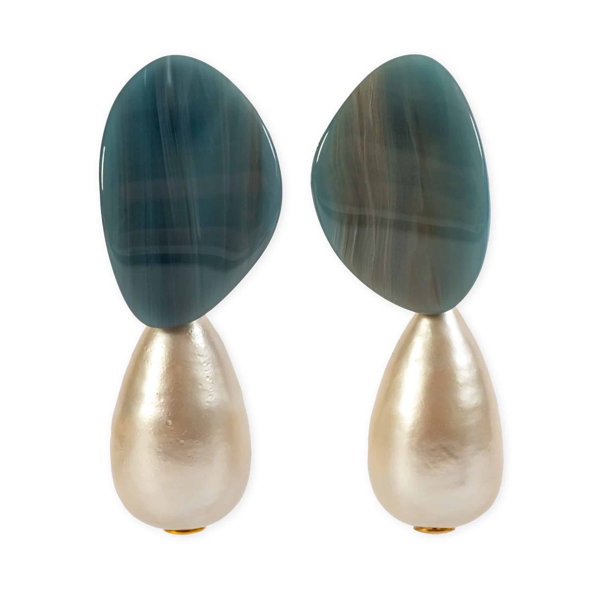 Deze sculpturale oorbellen combineren blauwe zijdeparel druppels met een glanzend teal bovenstuk – een harmonieus contrast van kleur en vorm. Het ontwerp voelt organisch en vloeiend, met een stijlvolle uitstraling.
