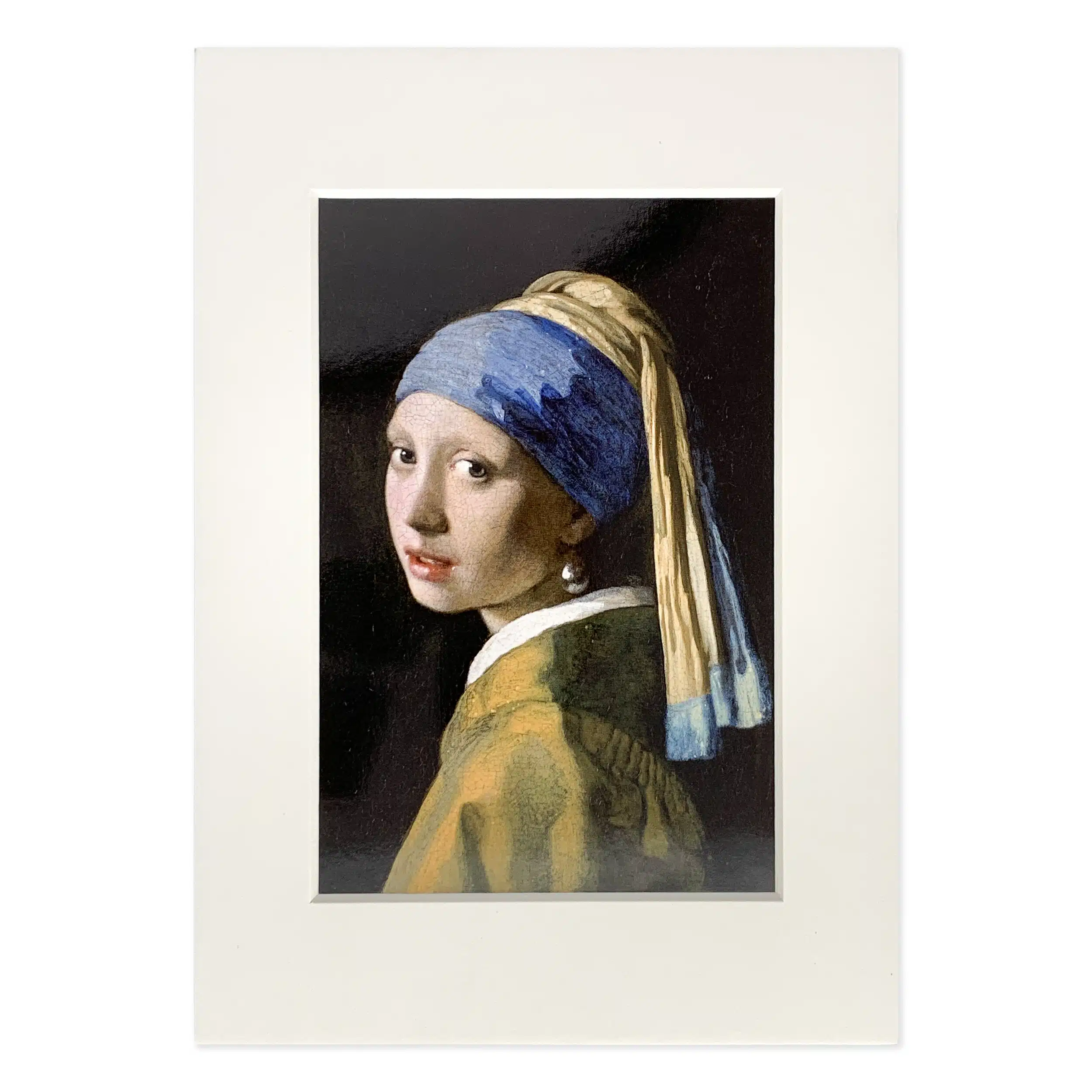 Passepartout van dik karton met meisje met de parel van Vermeer.De cremekleurige rand geeft de afbeelding meer diepte en uitstraling.We hanteren standaard maten zodat ze in kant en klare lijsten passen.De passepartouts kunnen ook, door handig systeem achter de kaart, worden neergezet of opgehangen.