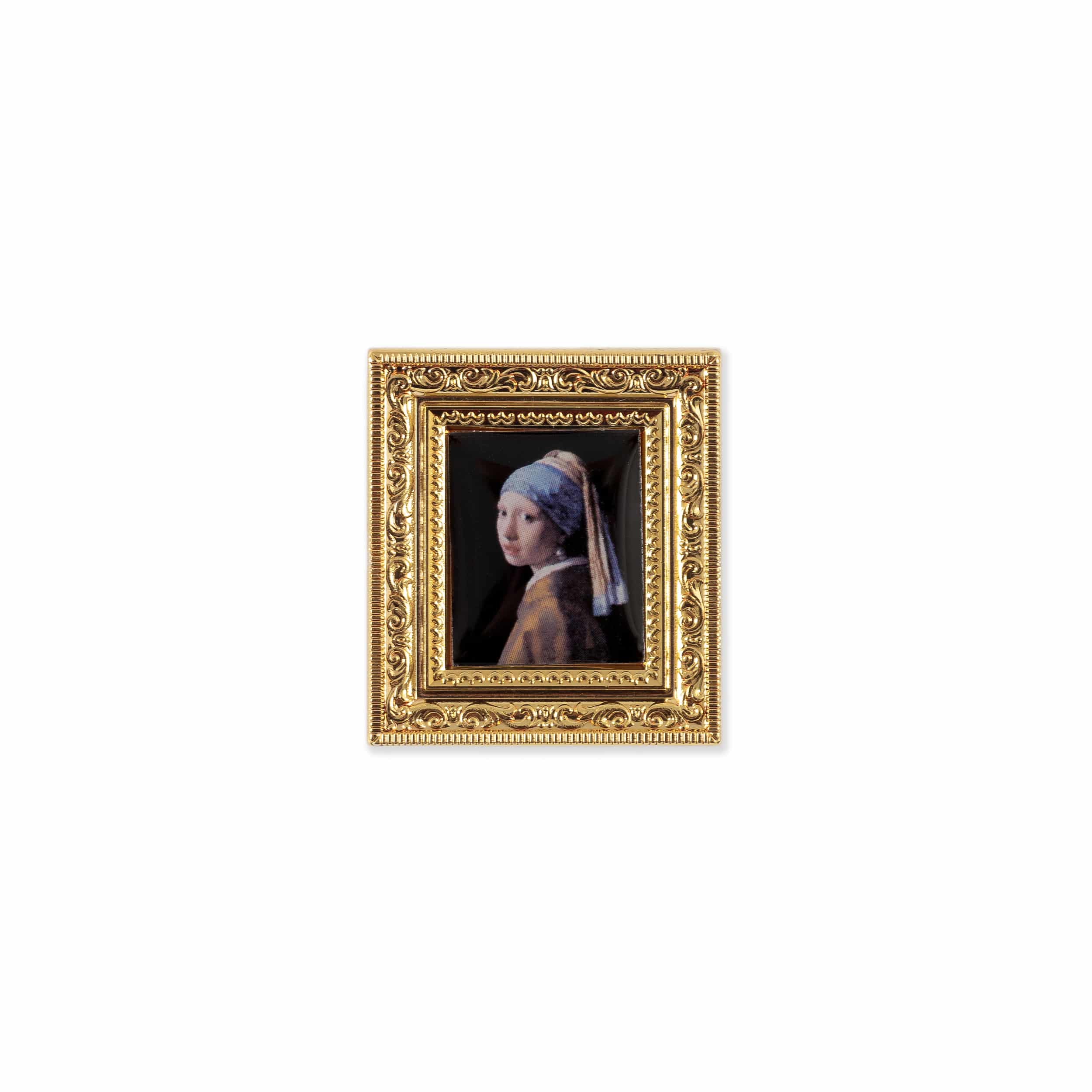 Een revers pin van het schilderij Meisje met de parel van Vermeer in een goud lijstje. Geeft uw outfit een “ kunstig” tintje en kan gedragen worden door dames en heren. Leuk voor de verzameling.