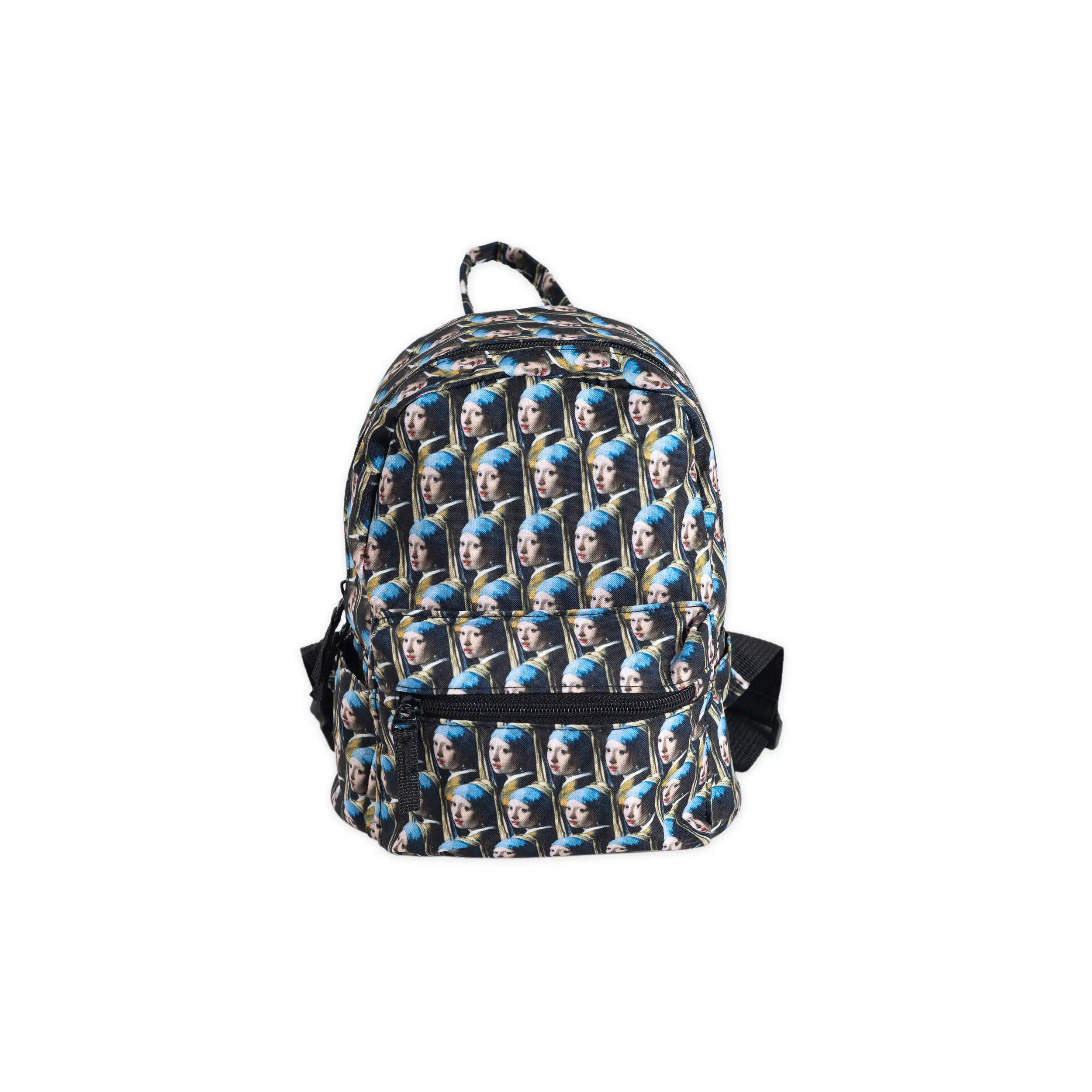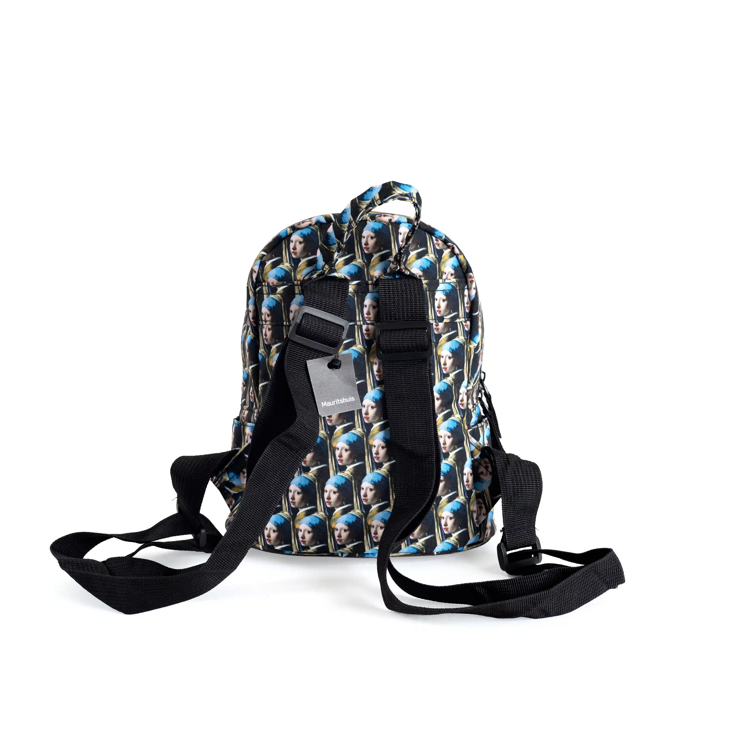 Charmant klein formaat rugzakje met hele kleine afbeeldingen van Meisje met de parel van Vermeer.De tas heeft verstelbare schouderbanden, een binnenvakje en een afsluitbare buitenvak met rits.Geschikt voor zowel kinderen als volwassenen.