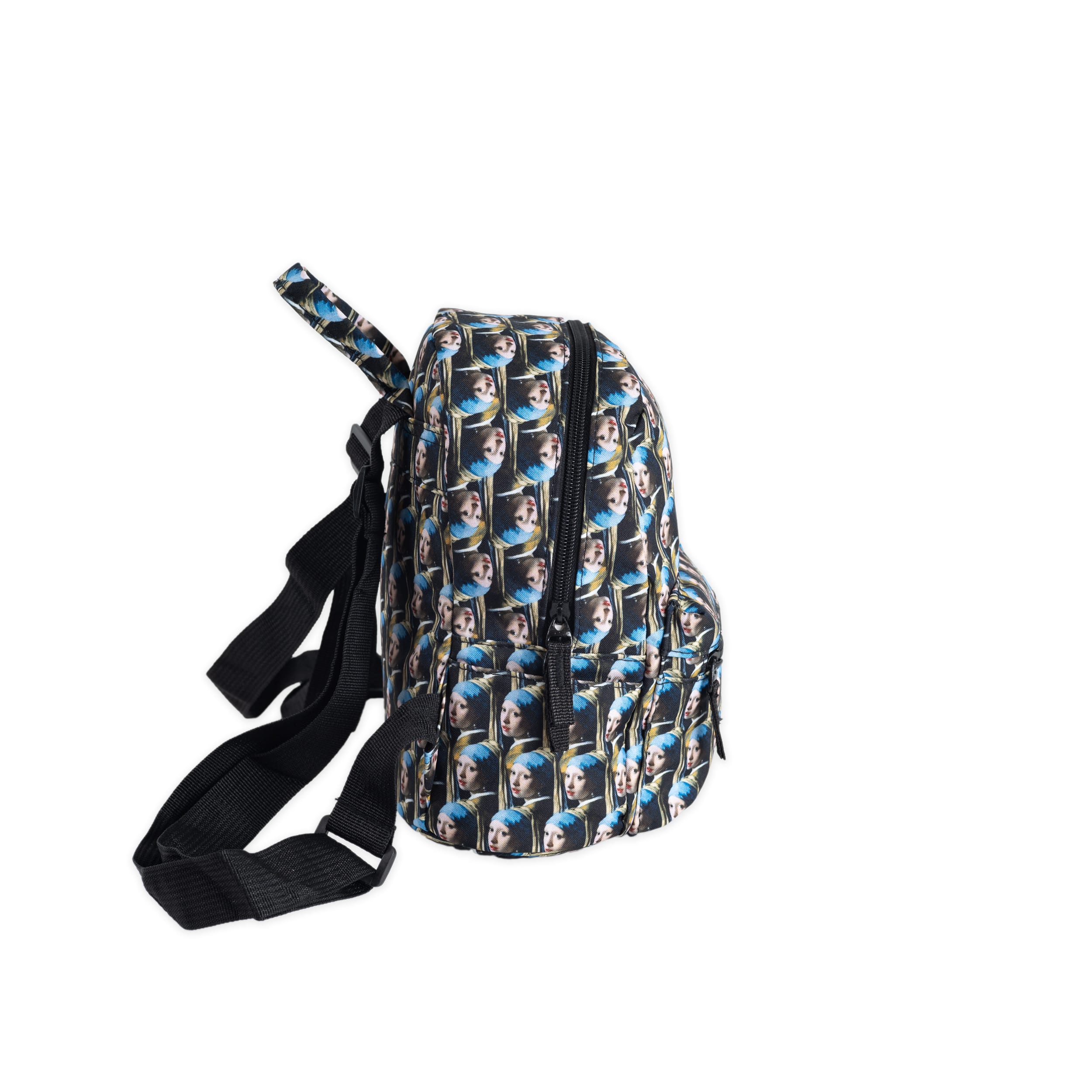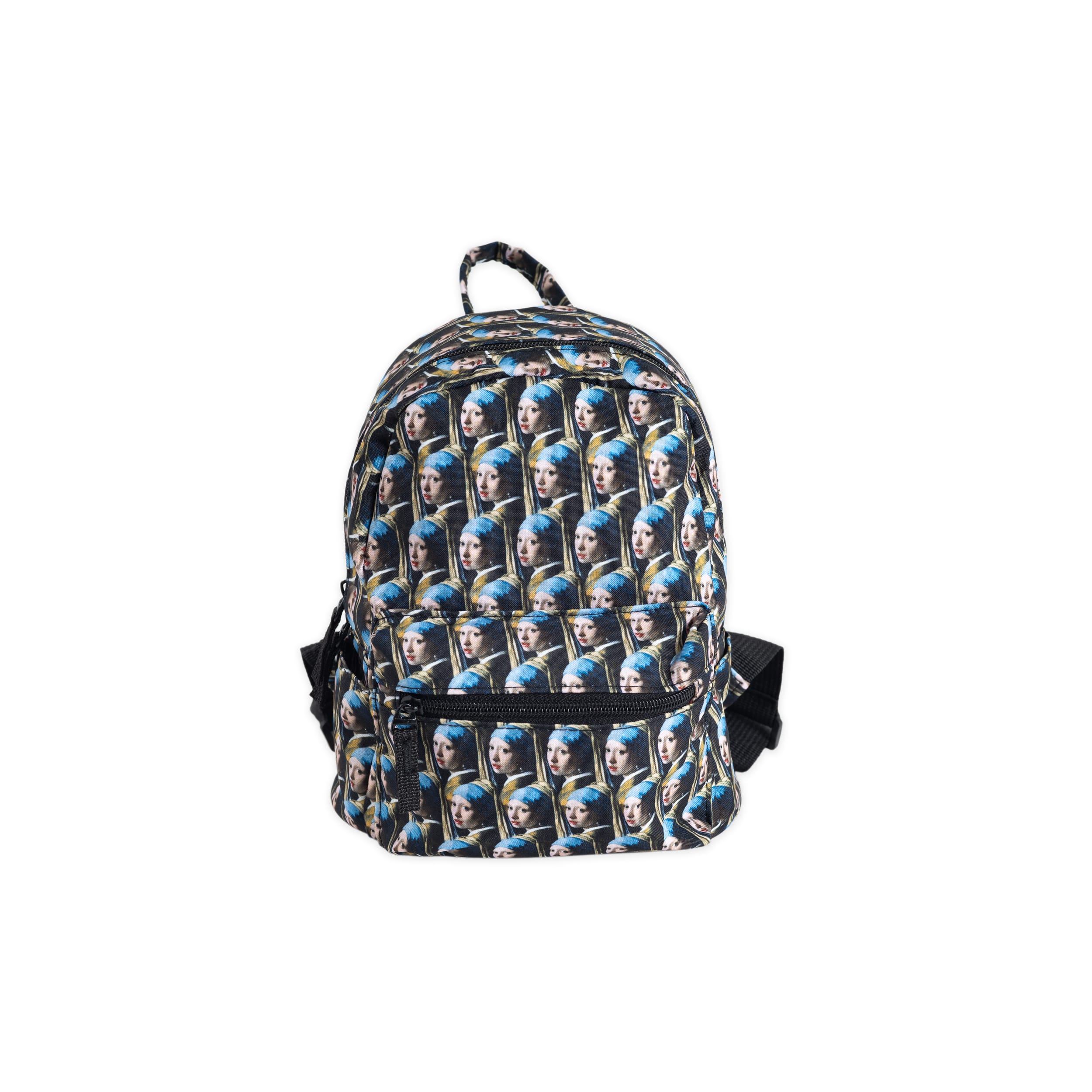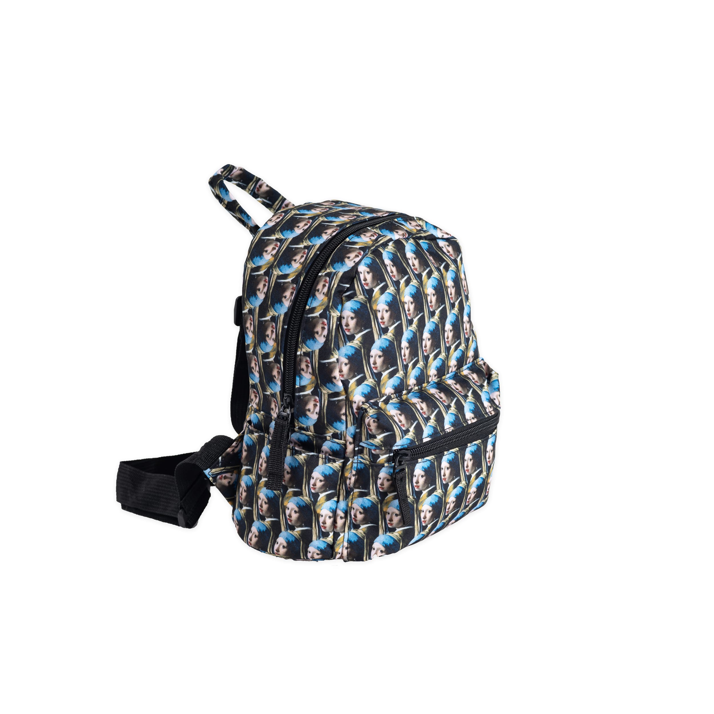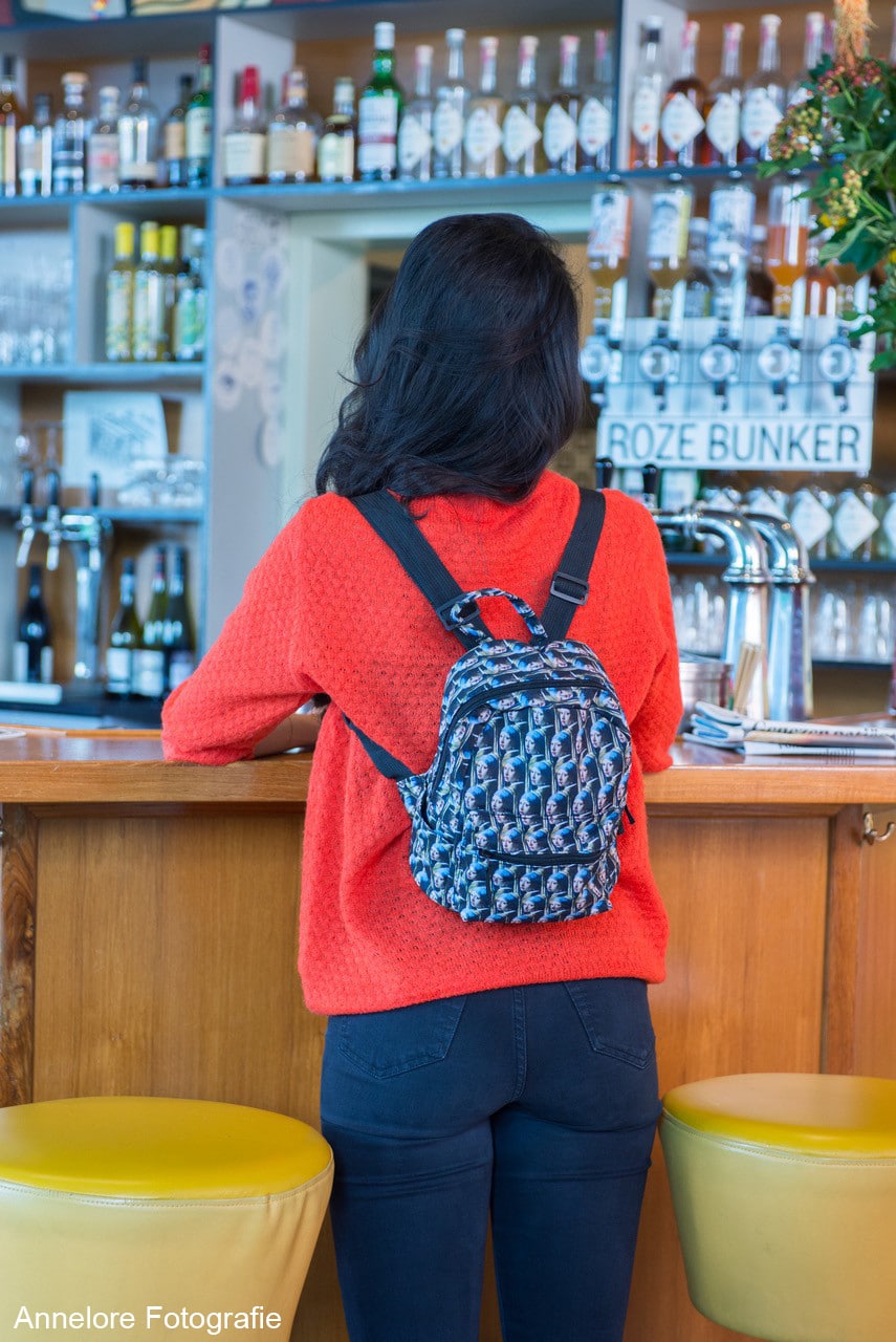 Charmant klein formaat rugzakje met hele kleine afbeeldingen van Meisje met de parel van Vermeer.De tas heeft verstelbare schouderbanden, een binnenvakje en een afsluitbare buitenvak met rits.Geschikt voor zowel kinderen als volwassenen.