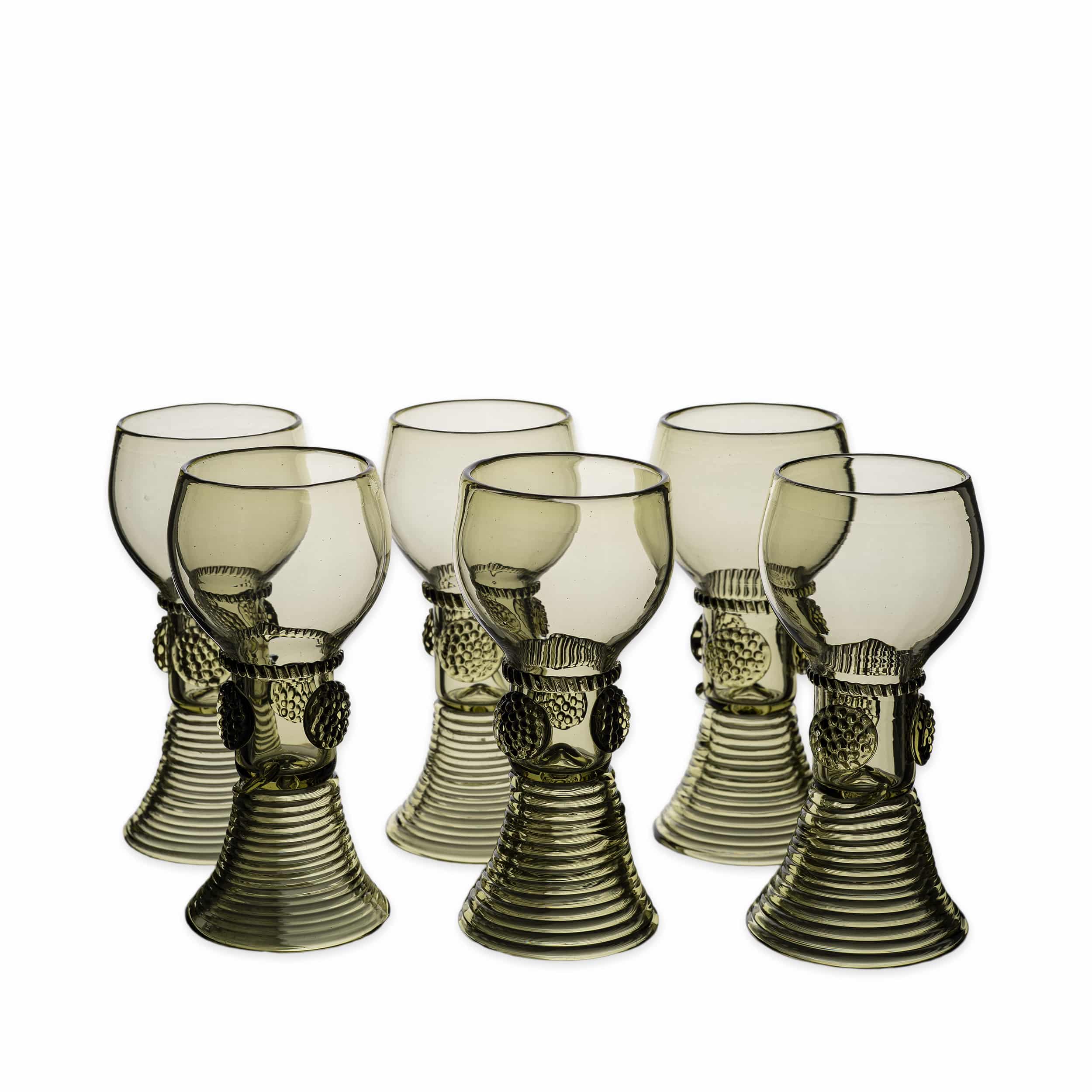 Bosglas ( Waldglas) kwam uit het bosgebied van Midden – Europa waar de benodigde grondstoffen onder handbereik waren.Potas uit asresten van beukenhout, adelaarsvarens en wat ijzeroxide gaven het bosglas de kenmerkende groene of bruine kleur.De noppen en bramen aan de buitenkant van het glas zorgde voor een goede grip.De mondgeblazen glazen kunnen qua vorm en kleur verschillen en hebben soms luchtbellen.Onze glazen replica’s uit de 17e eeuw komen uit Tsjechië.