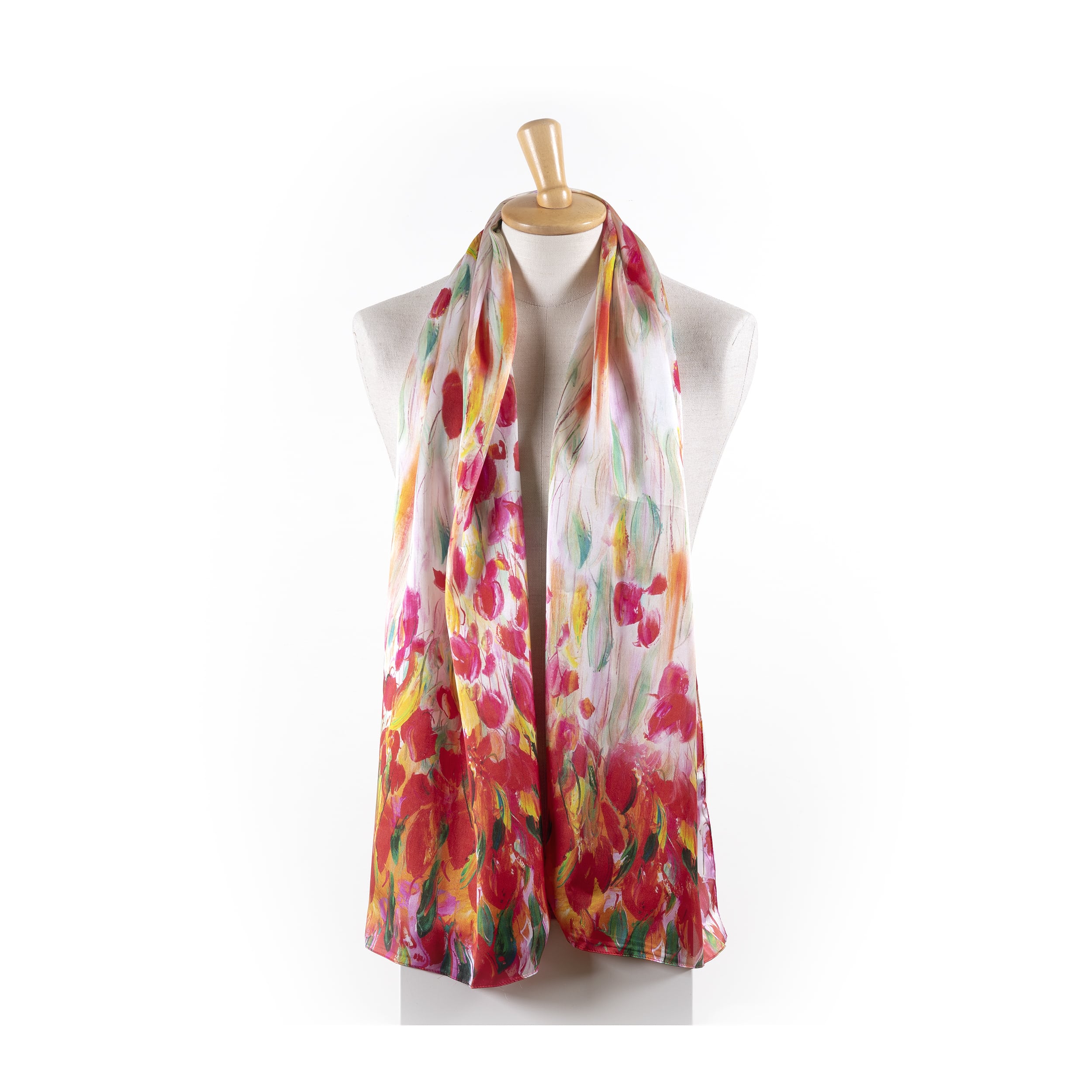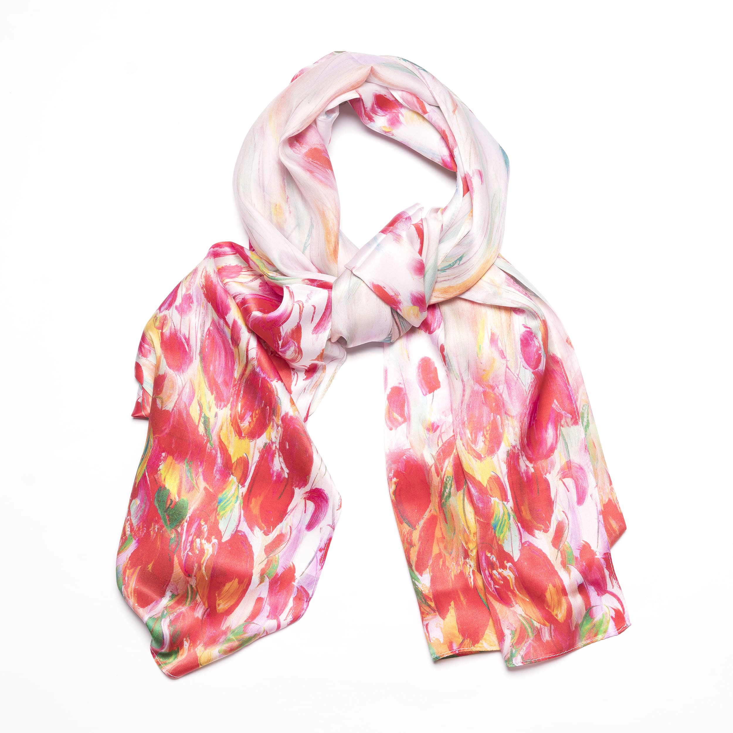 Shawl Tulpen Rood, zijdeZijde geleverd in zwarte cadeaudoos Materiaal: 100% zijde Afmeting: ca. 180 x 52 cm
