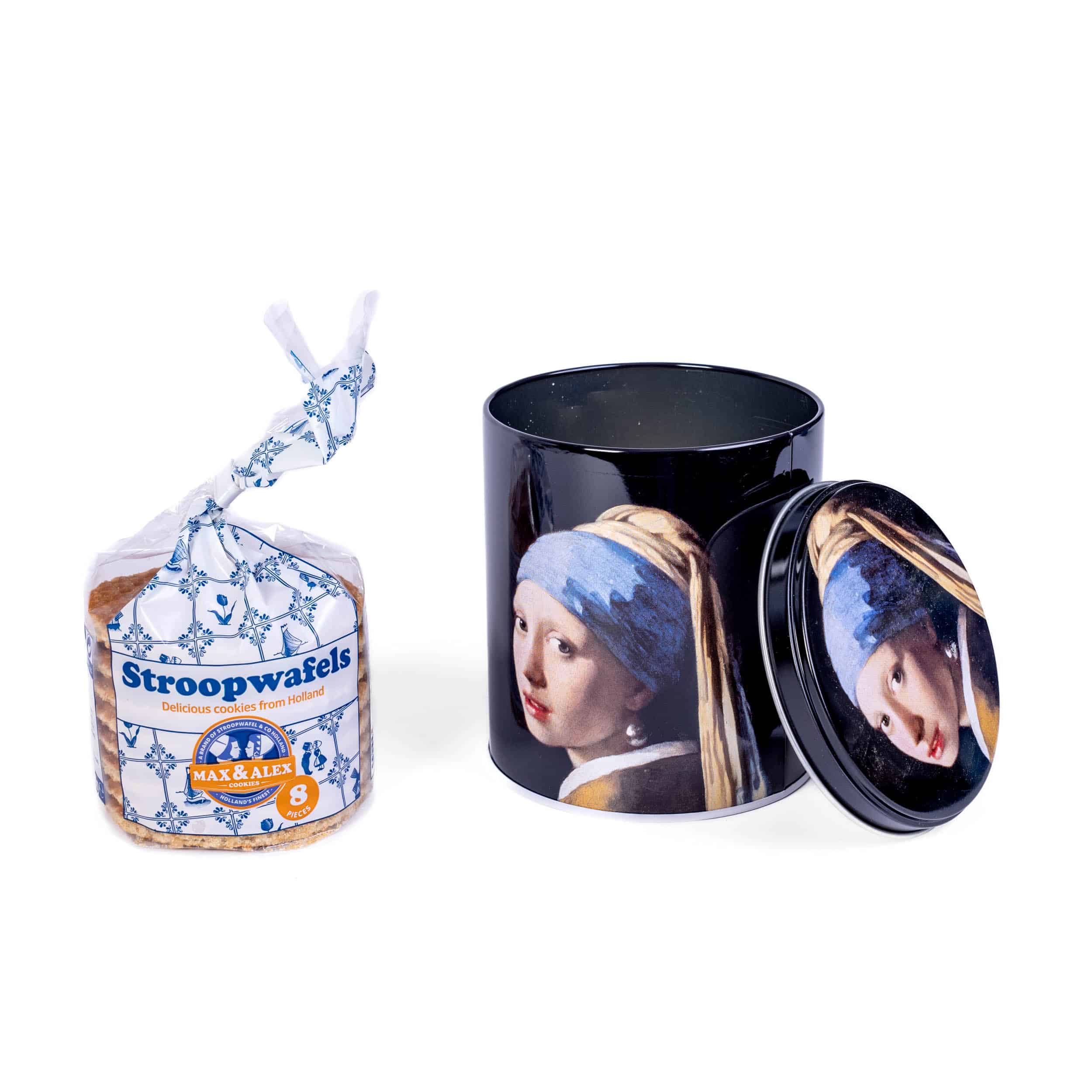 Nederlands meest beroemde wafels in een stevig bewaarblik met een afbeelding van Vermeer, Meisje met de parel.