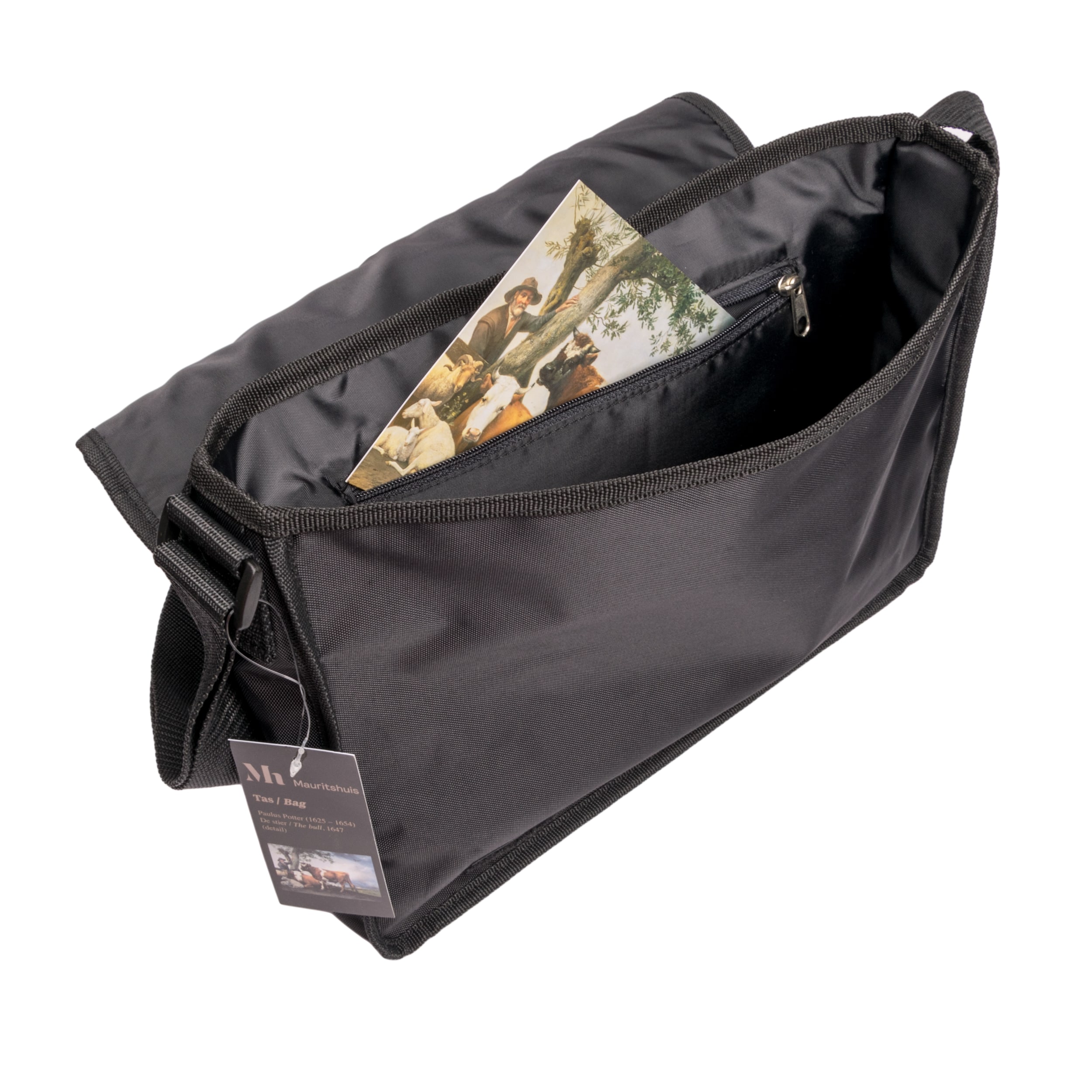 Kleine messenger bag met een detail van Paulus Potter De stier.De tas heeft aan de binnenzijde een opbergvakje met ritssluiting en een verstelbare schouderriem.