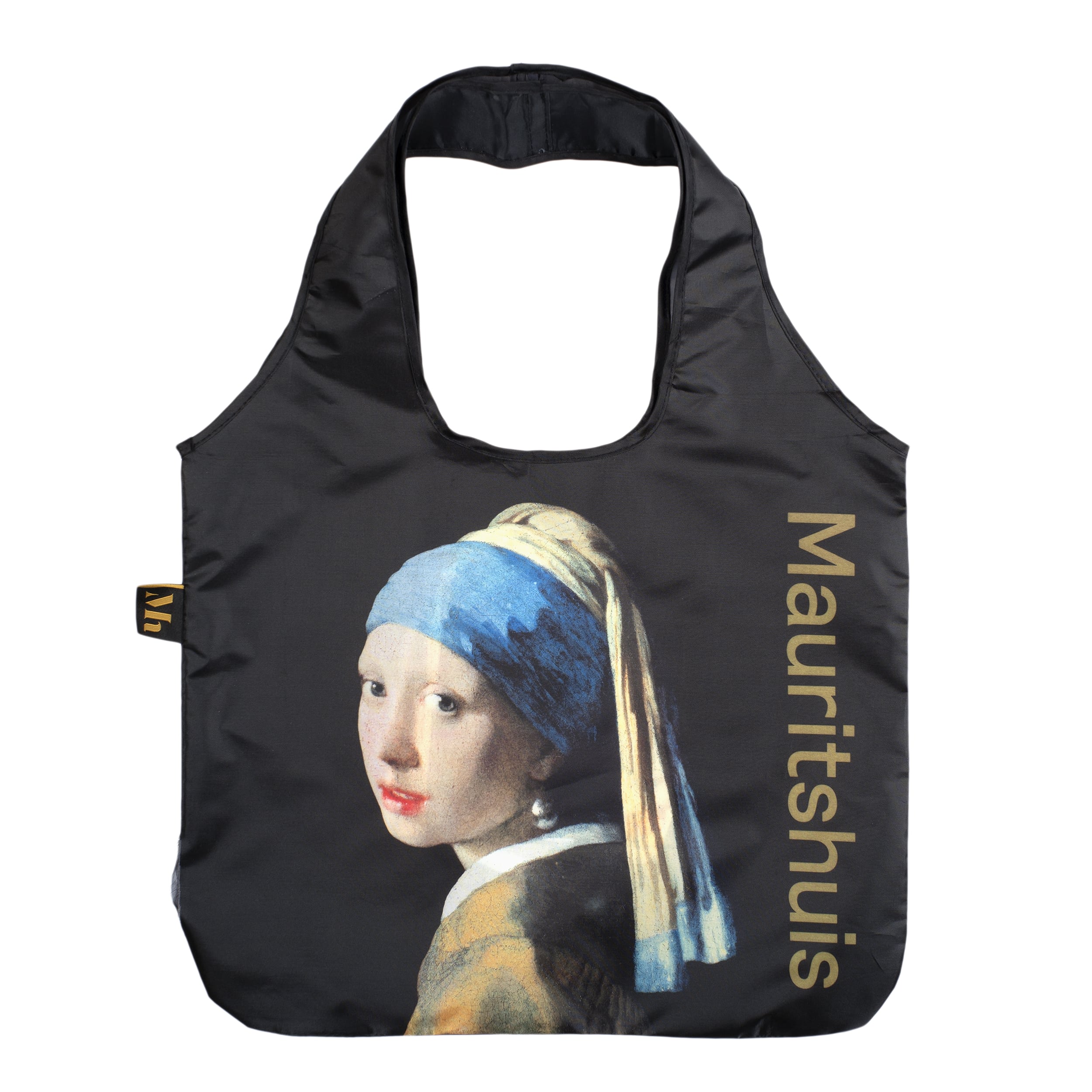 De draagtas met Vermeers Meisje met de parel kan handig worden opgevouwen in het aangehechte tasje. De tas is aan beide zijden bedrukt en gemaakt van gerecycled polyester.