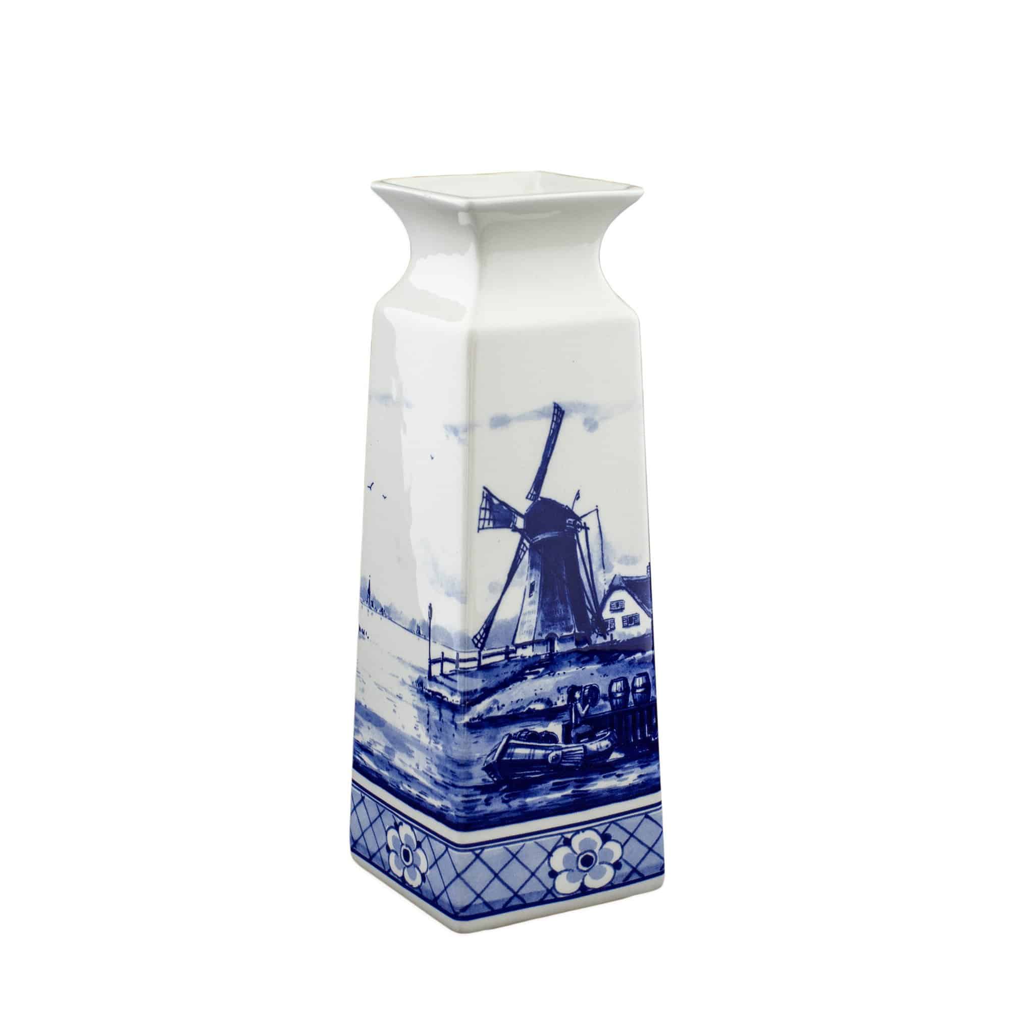 Deze bijzondere vaas valt meteen op door zijn rechthoekige vorm. De ongewone vorm geeft de vaas een moderne uitstraling, terwijl de schildering van een typisch Nederlands landschap verwijst naar het traditionele Delftsblauw.