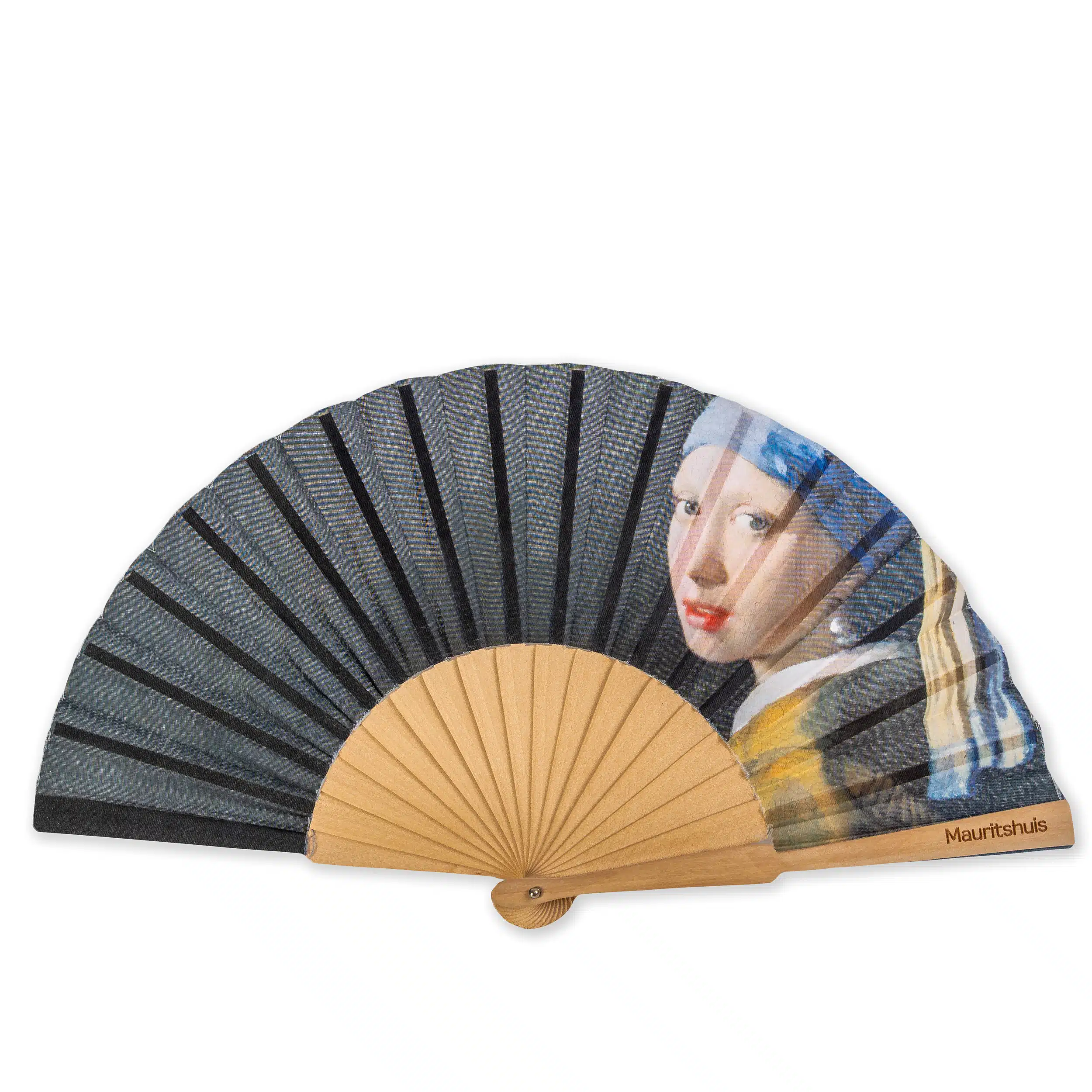 Deze elegante, opvouwbare handwaaier is versierd met een reproductie van het beroemde schilderij Meisje met de parel. Zo draag je dit icoon van het Mauritshuis in Den Haag altijd bij je.