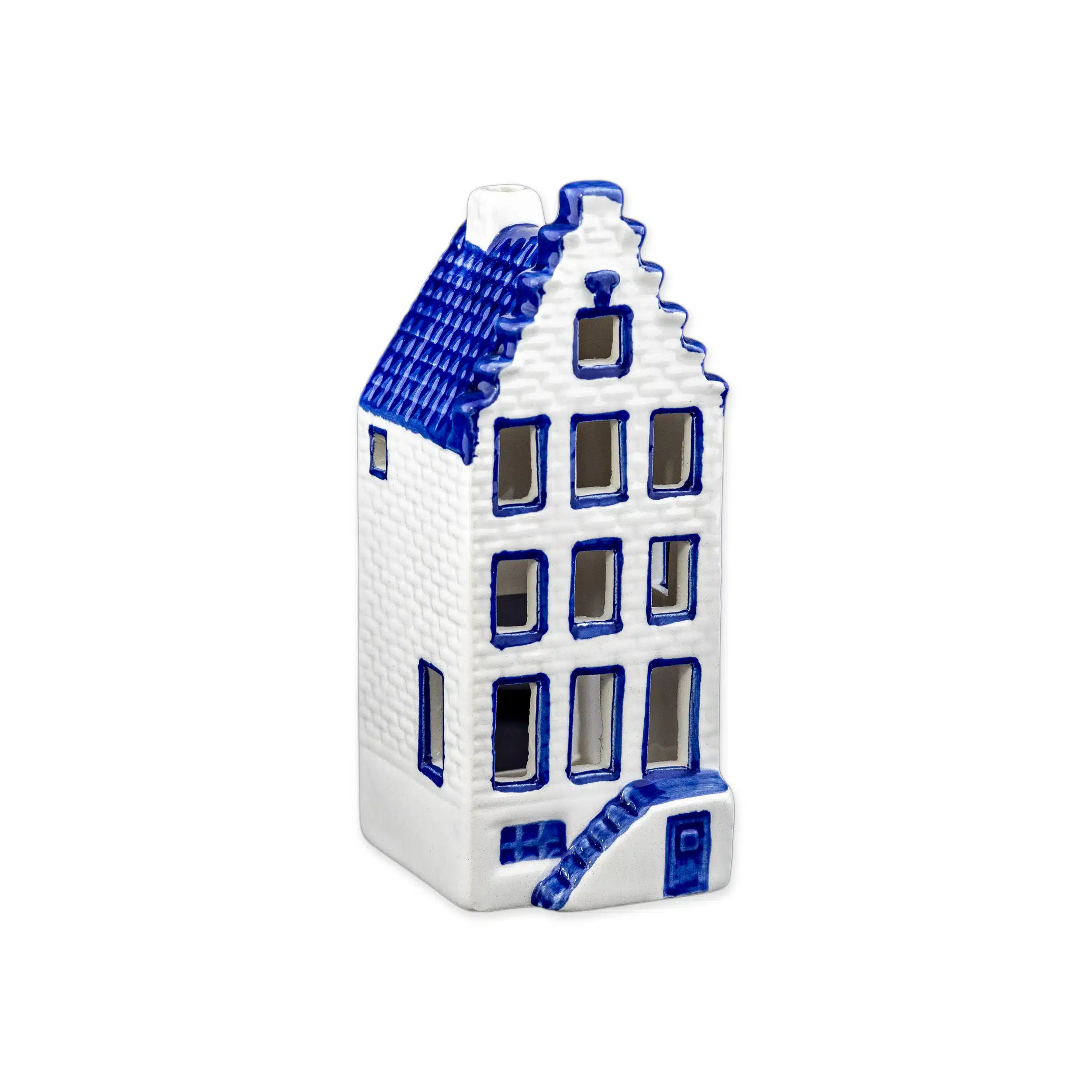 Vrolijk donkere hoekjes op met deze leuke waxinelichthouder in de vorm van een grachtenpandje. Het grachtenpandje heeft veel details, zoals de kleine ruiten waardoor het kaarslicht naar buiten valt, de bakstenen muren en het Delfts blauwe dak. Het meestopvallende is toch wel de schitterende trapgevel. Combineer het waxinelichthuisje met de andere varianten kaarshouders voor een gezellige grachtengordel vol kaarslicht.